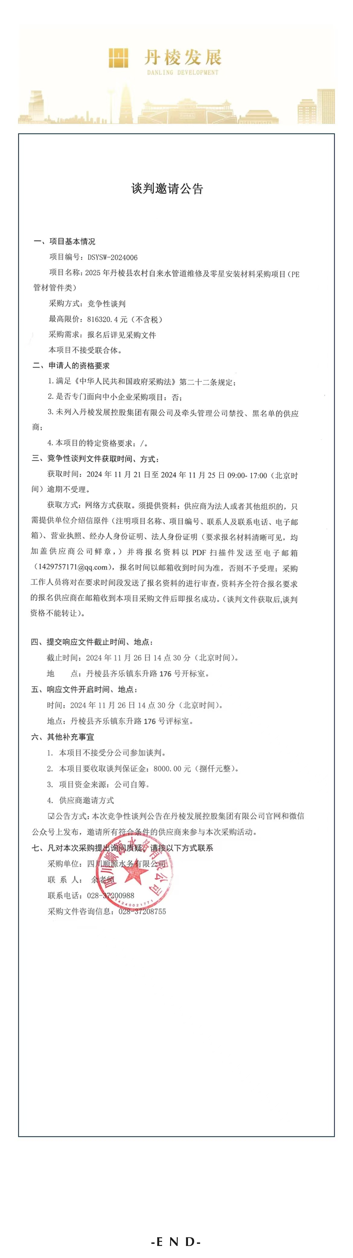 2025年丹棱縣農村自來(lái)水管道維修及零星安裝材料采購項目(PE管材管件類(lèi))談判邀請公告
