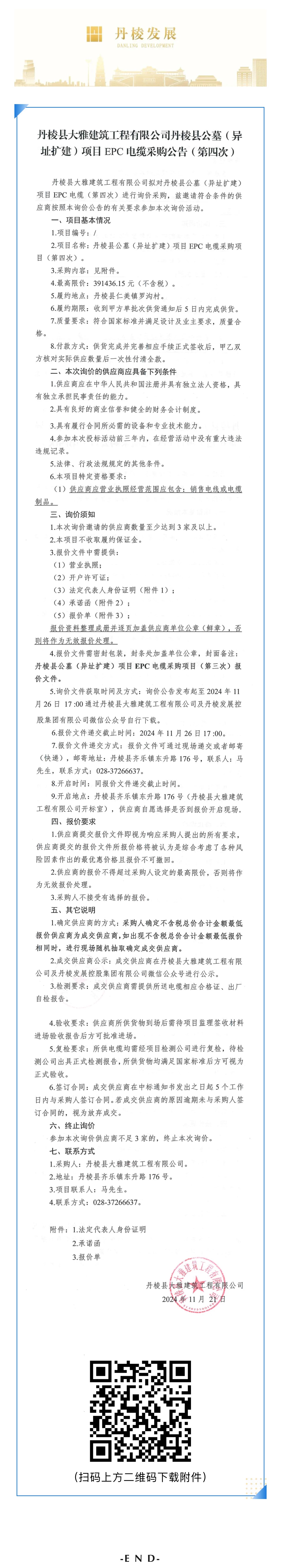 丹棱縣大雅建筑工程有限公司丹棱縣公墓(異址擴建)項目EPC電纜采購公告(第四次)