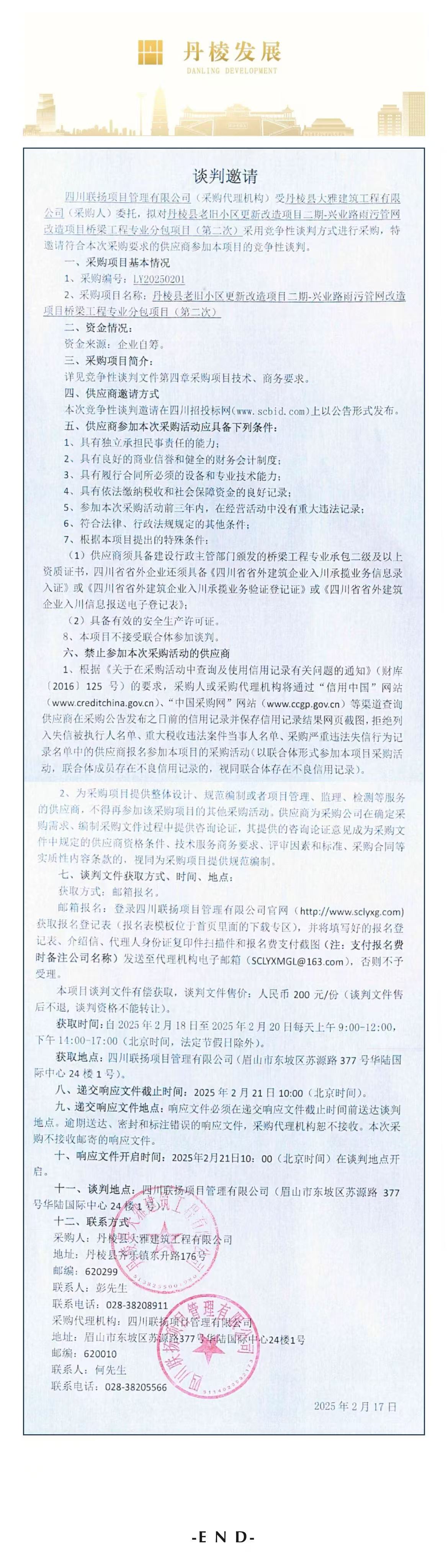 丹棱縣老舊小區更新改造項目二期-興業(yè)路雨污管網(wǎng)改造項目橋梁工程專(zhuān)業(yè)分包項目談判邀請公告(第二次)