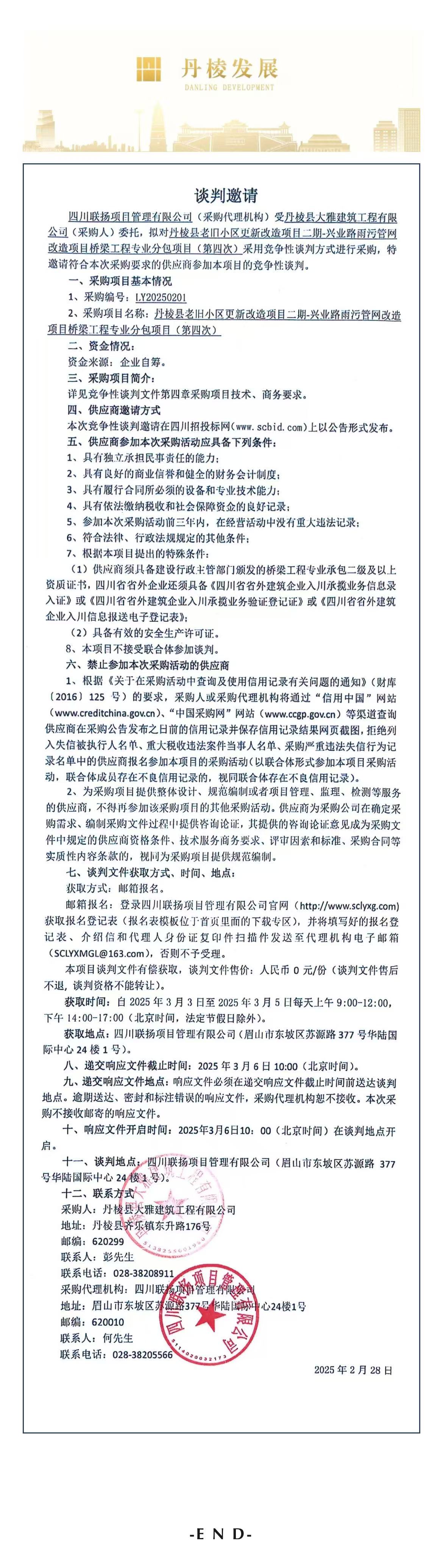 丹棱縣老舊小區更新改造項目二期-興業(yè)路雨污管網(wǎng)改造項目橋梁工程專(zhuān)業(yè)分包項目談判邀請公告(第四次)