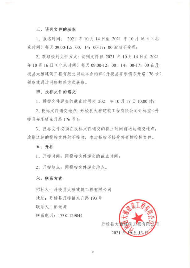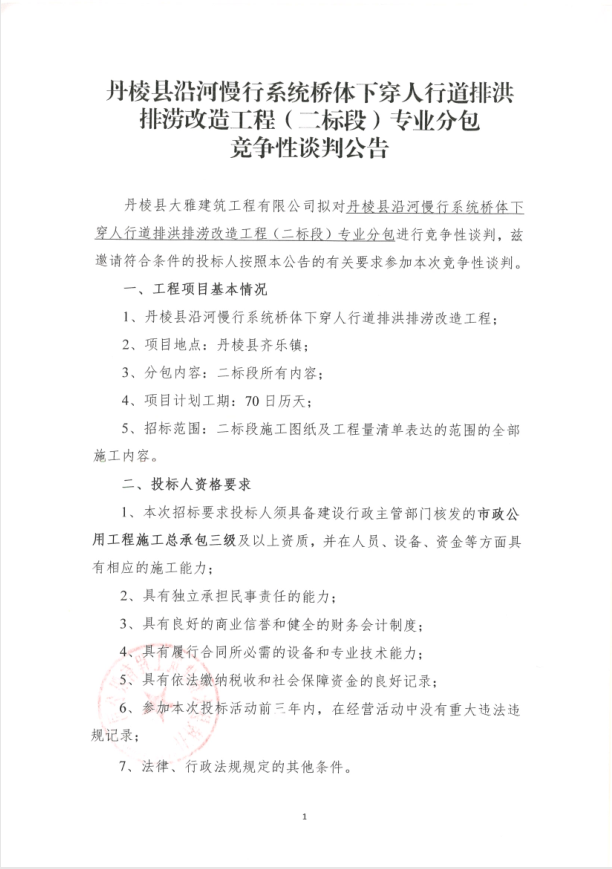 【大雅建筑公司】丹棱縣沿河慢行系統橋體下穿人行道排洪排澇改造工程(二標段)專(zhuān)業(yè)分包競爭性談判公告