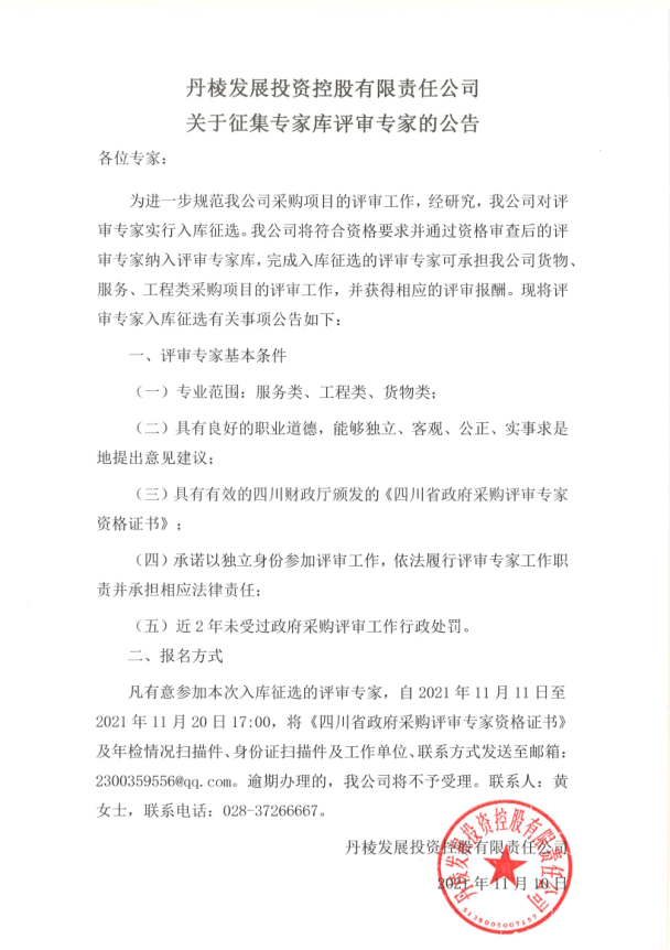 【丹發(fā)展公司】丹棱發(fā)展投資控股有限責任公司關(guān)于征集專(zhuān)家庫評審專(zhuān)家的公告