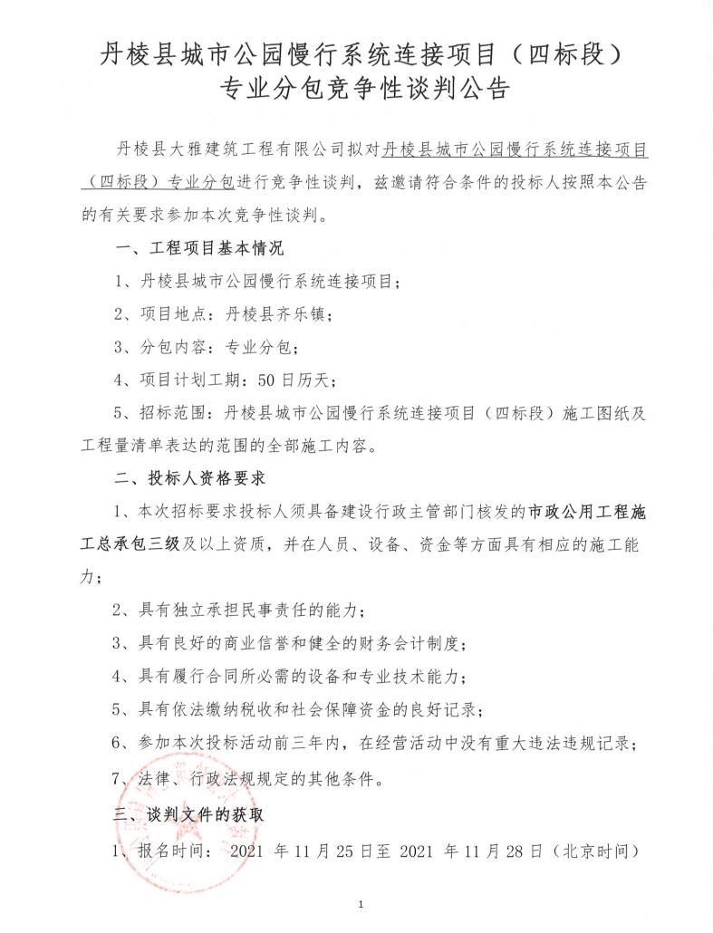 【大雅建筑公司】丹棱縣城市公園慢性系統連接項目(四標段)專(zhuān)業(yè)分包競爭性談判公告
