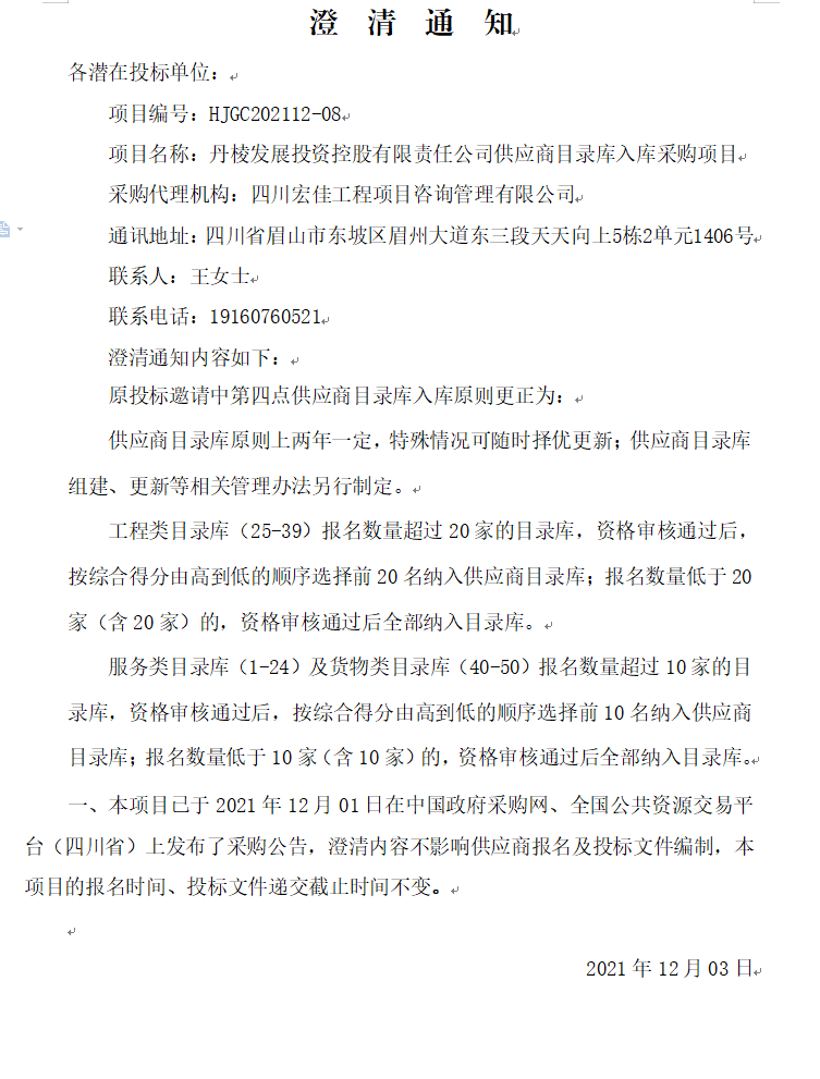【丹發(fā)展公司】丹棱發(fā)展投資控股有限責任公司供應商目錄庫入庫采購項目澄清通知