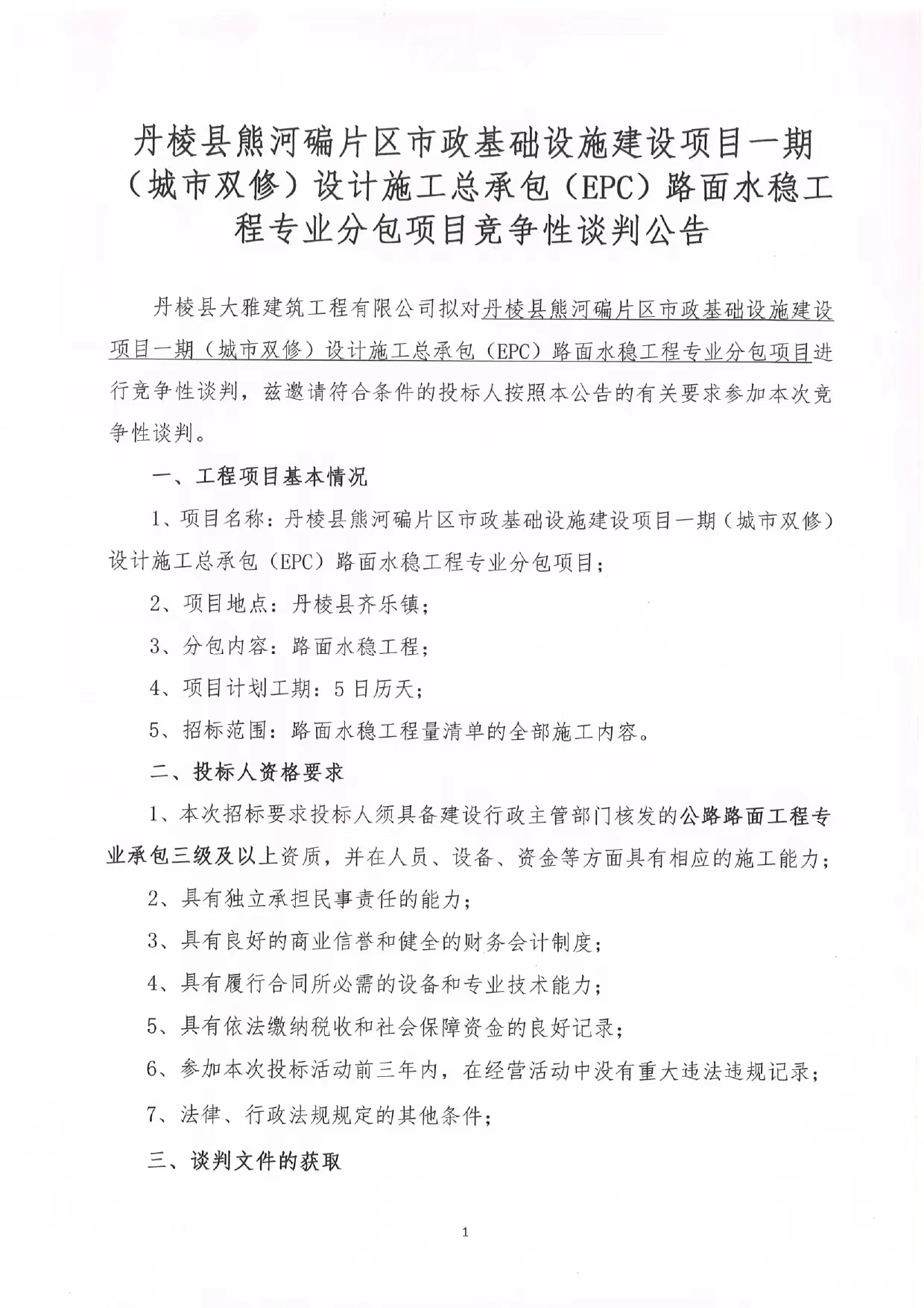 丹棱縣熊河碥片區市政基礎設施建設項目一期(城市雙修)設計施工總承包(EPC)路面水穩工 程專(zhuān)業(yè)分包項目競爭性談判公告