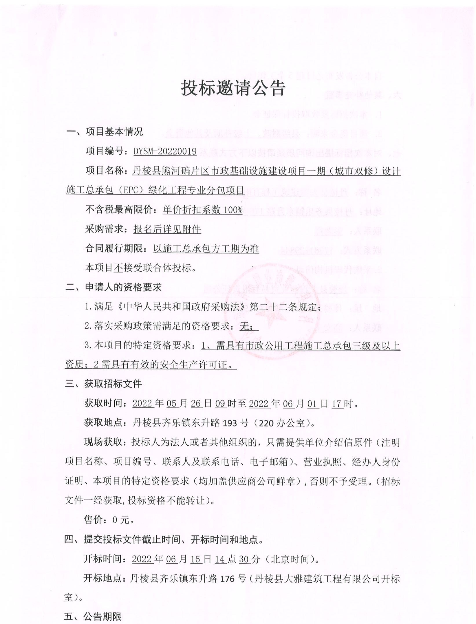 丹棱縣熊河碥片區市政基礎設施建設項目一期(城市雙修)設計施工總承包(EPC)綠化工程專(zhuān)業(yè)分包項目投標邀請公告