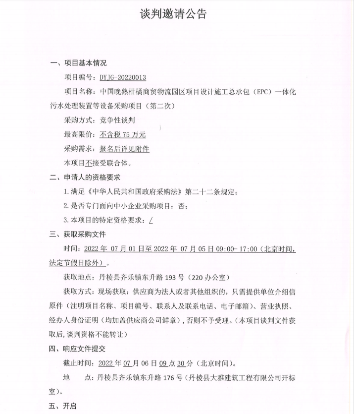 中國晚熟柑橘商貿物流園區項目設計施工總承包(EPC)一體化污水處理裝置等設備采購項目第二次談判邀請公告