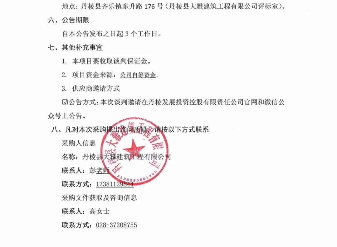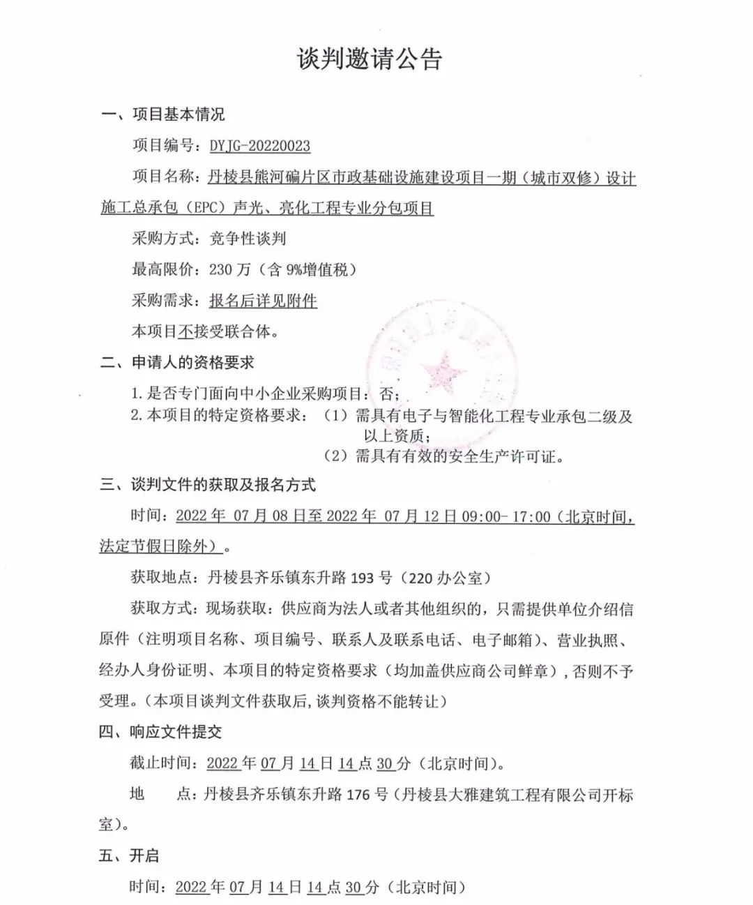 丹棱縣熊河碥片區市政基礎設施建設一期(城市雙修)設計施工總承包(EPC)聲光、亮化工程專(zhuān)業(yè)分包項目談判邀請公告