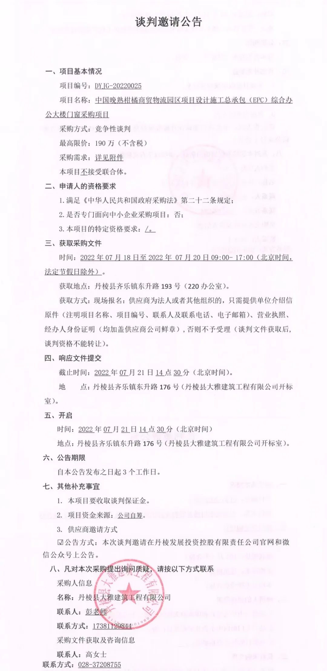 中國晚熟柑橘商貿物流園區項目設計施工總承包(EPC)綜合辦公大樓門(mén)窗采購項目談判邀請公告