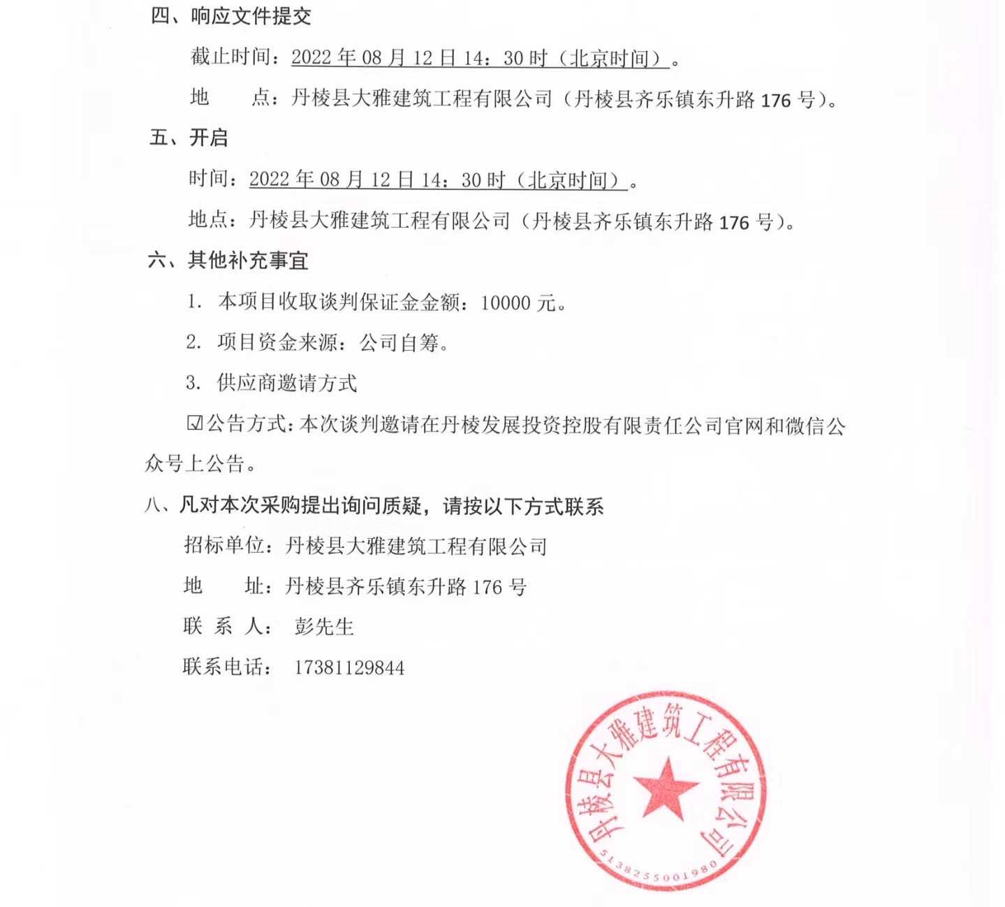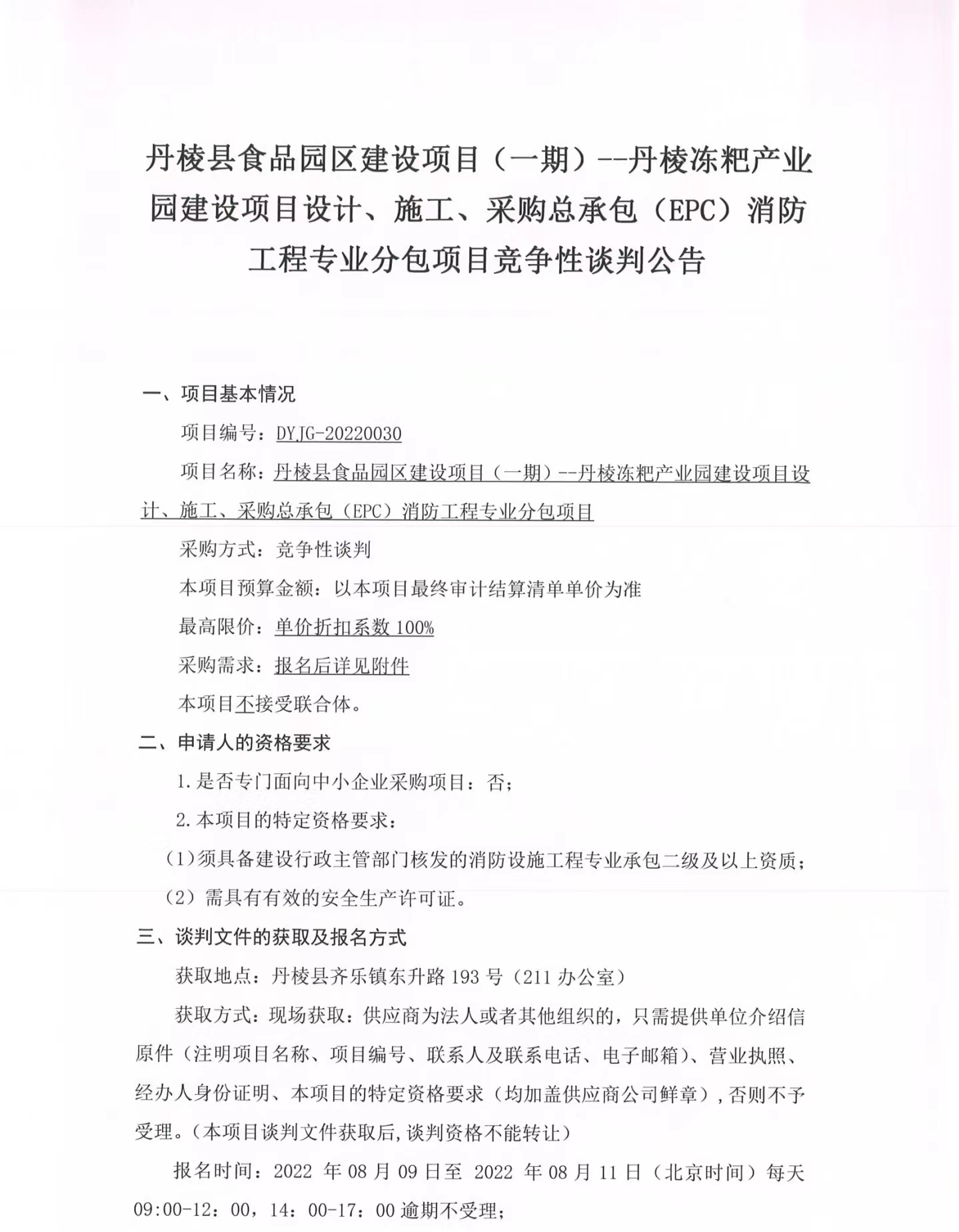 丹棱縣食品園區建設項目(一期)--丹棱凍粑產(chǎn)業(yè)園建設項目設計、施工、采購總承包(EPC)消防工程專(zhuān)業(yè)分包項目競爭性談判公告