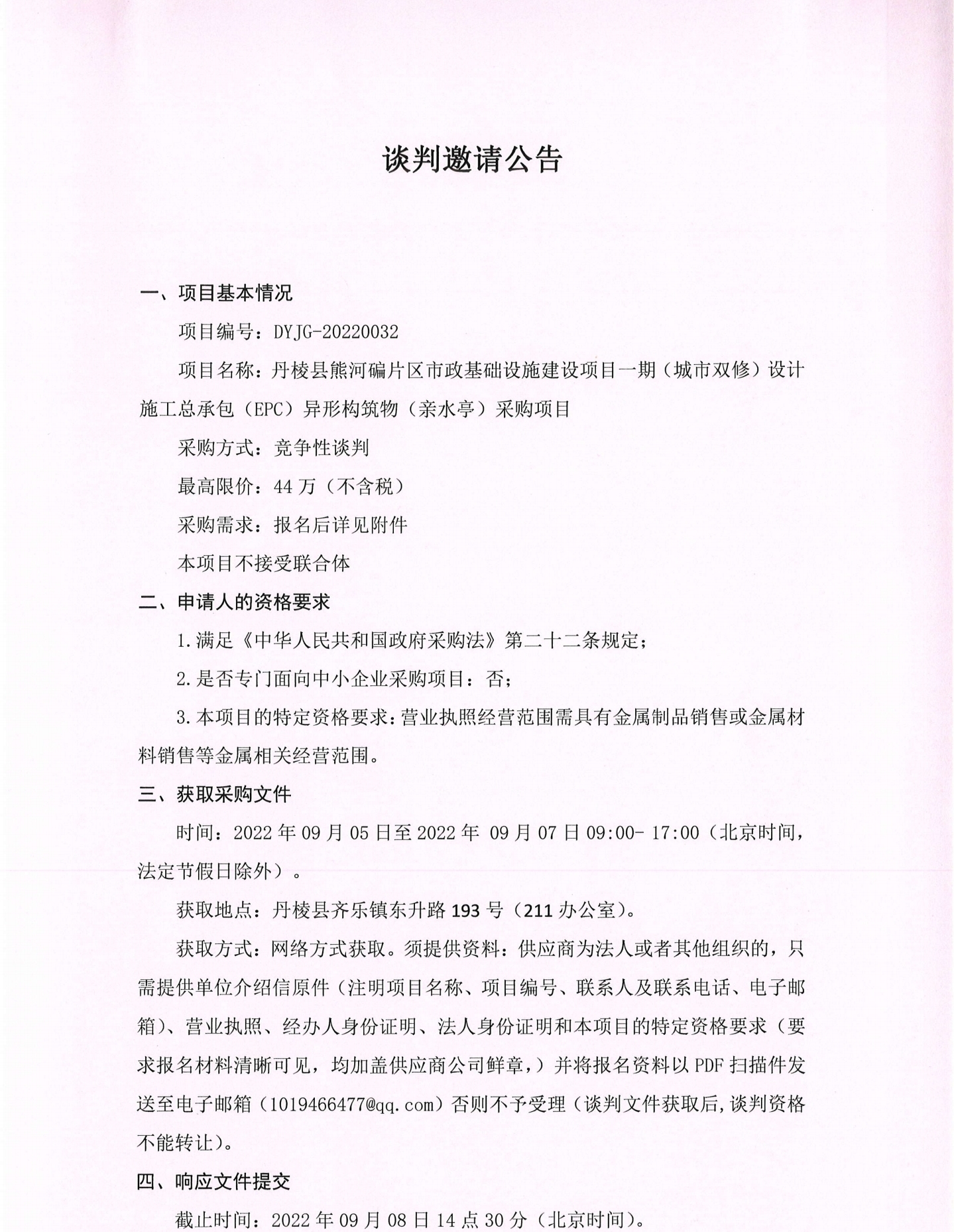 丹棱縣熊河碥片區市政基礎設施建設項目一期(城市雙修)設計施工總承包(EPC)異形構筑物(親水亭)采購項目談判邀請公告