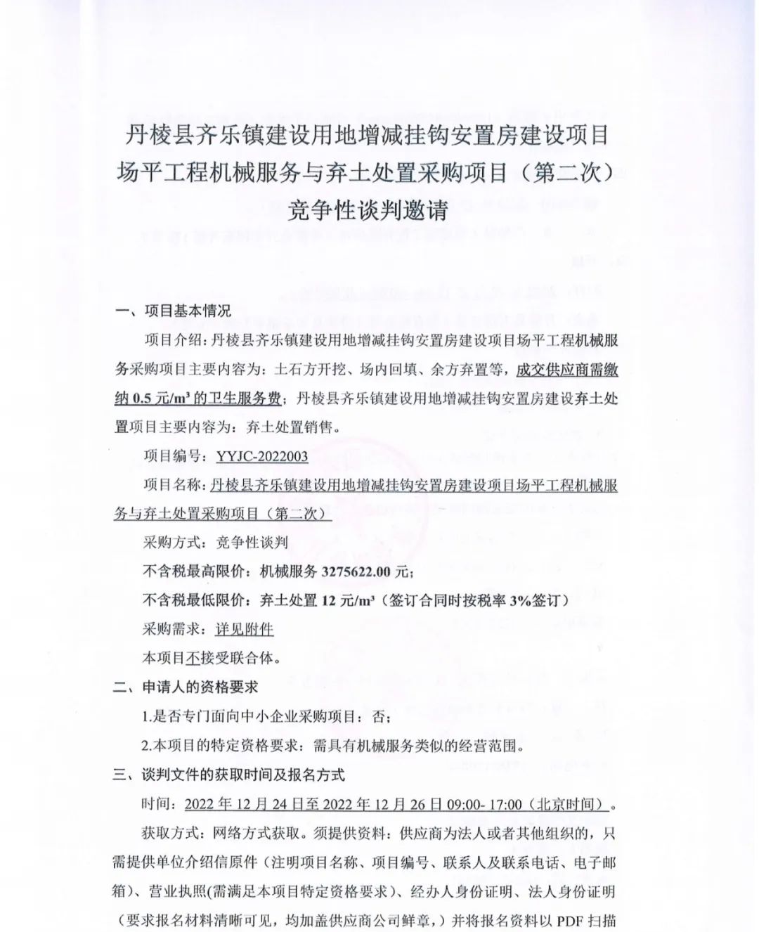 丹棱縣齊樂(lè )鎮建設用地增減掛鉤安置房建設項目場(chǎng)平工程機械服務(wù)與棄土處置采購項目(第二次)競爭性談判邀請
