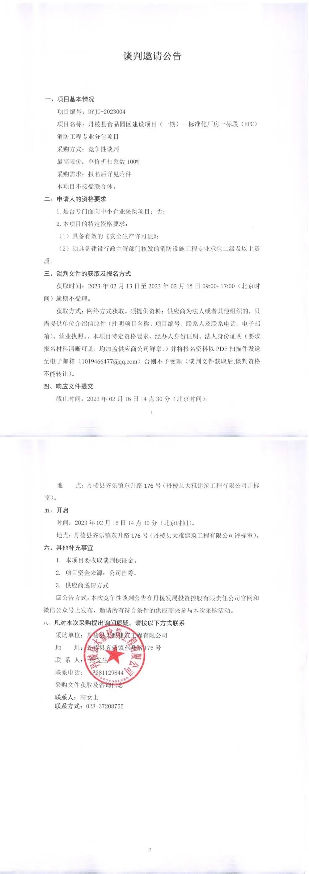 丹棱縣食品園區建設項目(一期)標準化廠(chǎng)房一標段(EPC)消防工程專(zhuān)業(yè)分包項目談判邀請公告