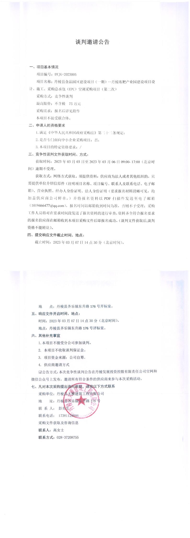 丹棱縣食品園區建設項目(一期)--丹棱凍粑產(chǎn)業(yè)園建設項目設計、施工、采購總承包(EPC)空調采購項目(第二次)談判邀請公告