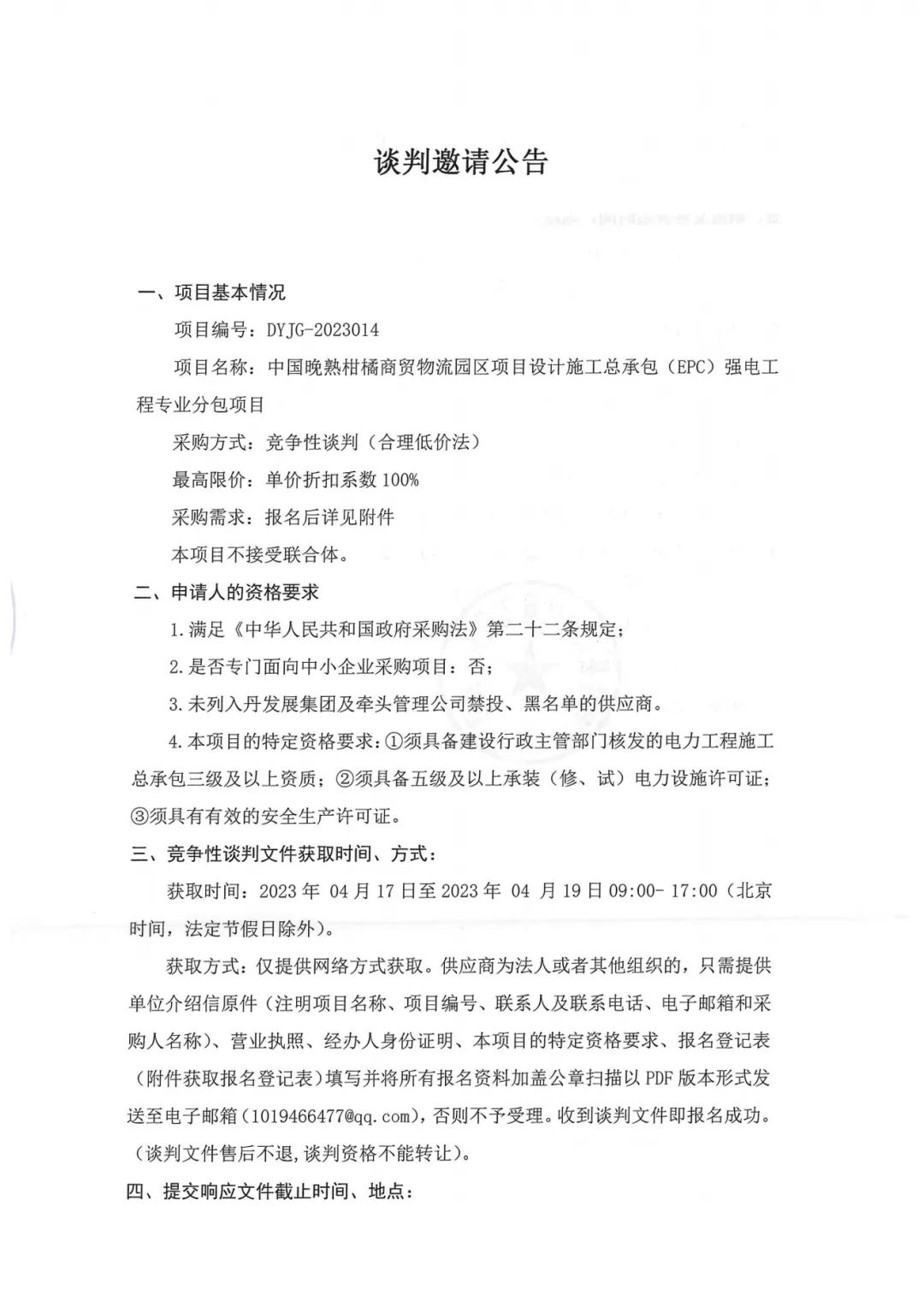 中國晚熟柑橘商貿物流園區項目設計施工總承包(EPC)強電工程專(zhuān)業(yè)分包項目談判邀請公告