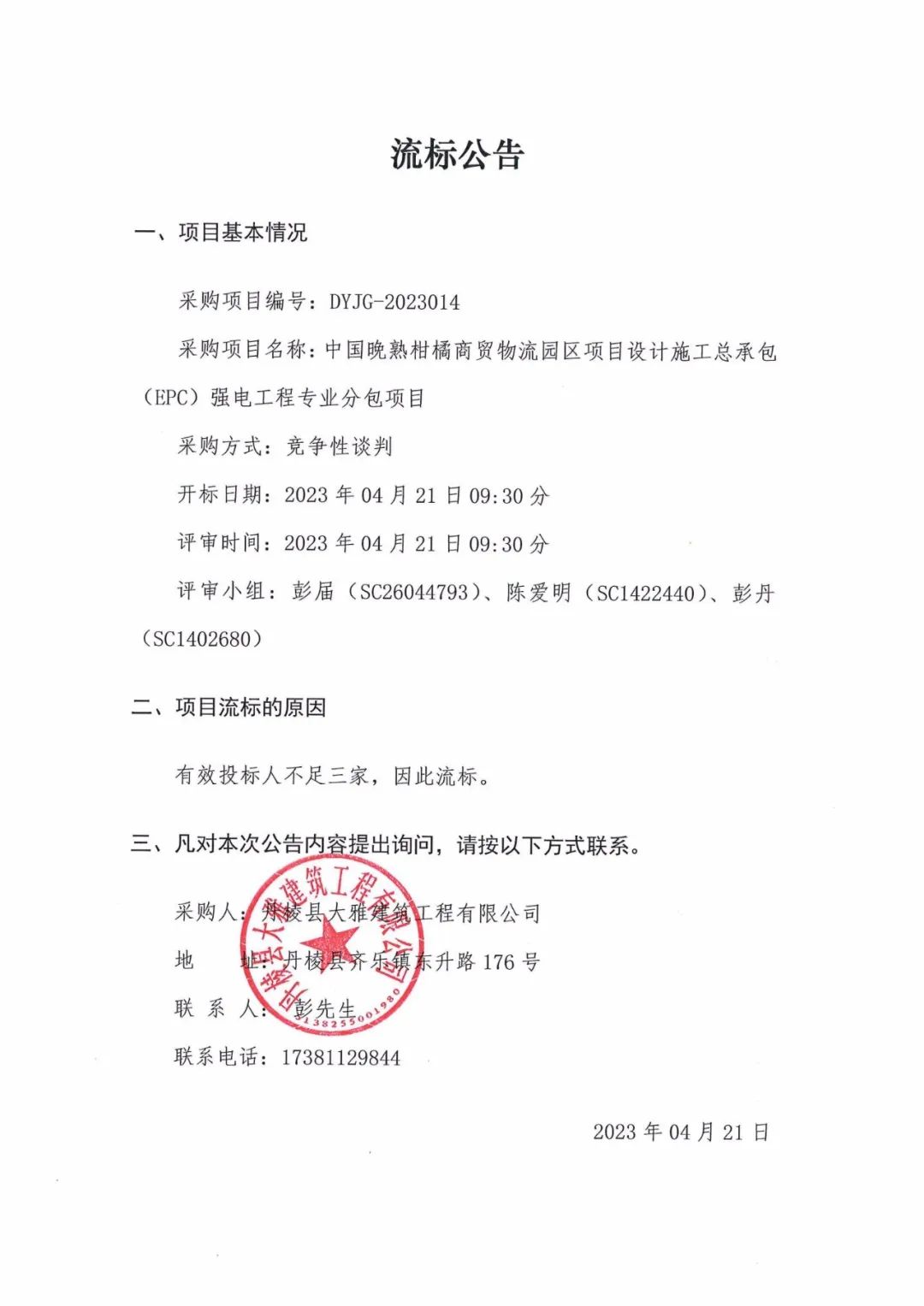 中國晚熟柑橘商貿物流園區項目設計施工總承包(EPC)強電工程專(zhuān)業(yè)分包項目流標公告