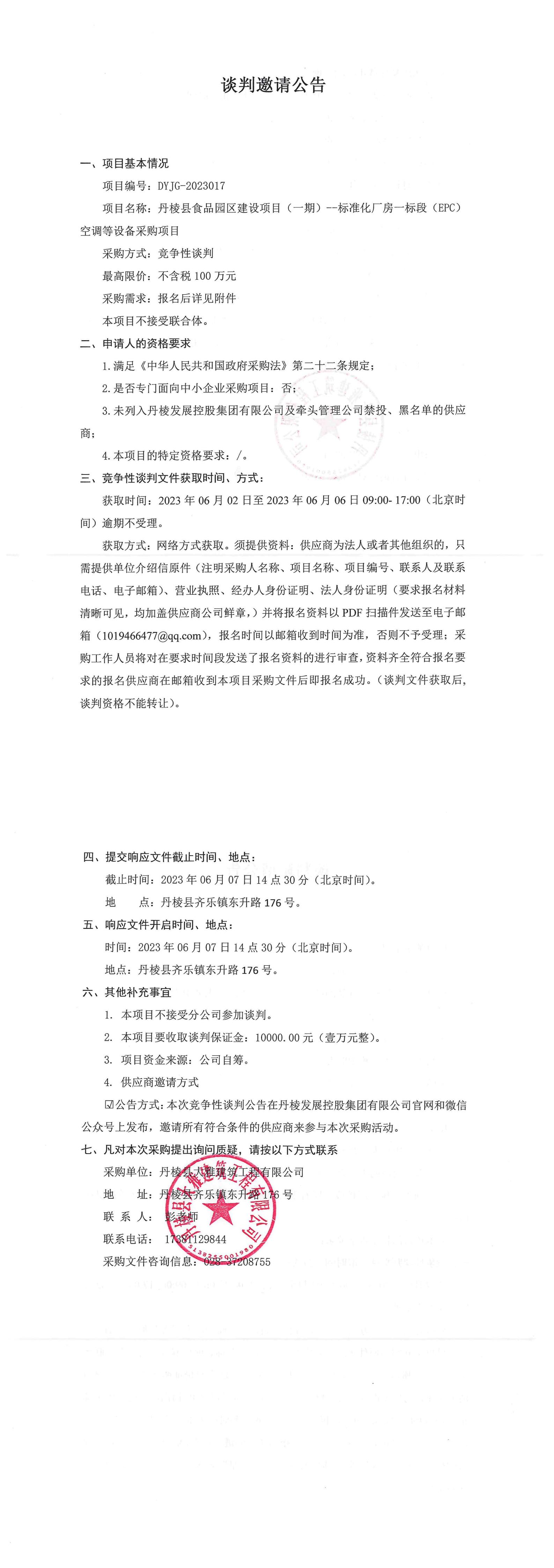 丹棱縣食品園區建設項目(一期)--標準化廠(chǎng)房一標段(EPC)空調等設備采購項目談判邀請公告