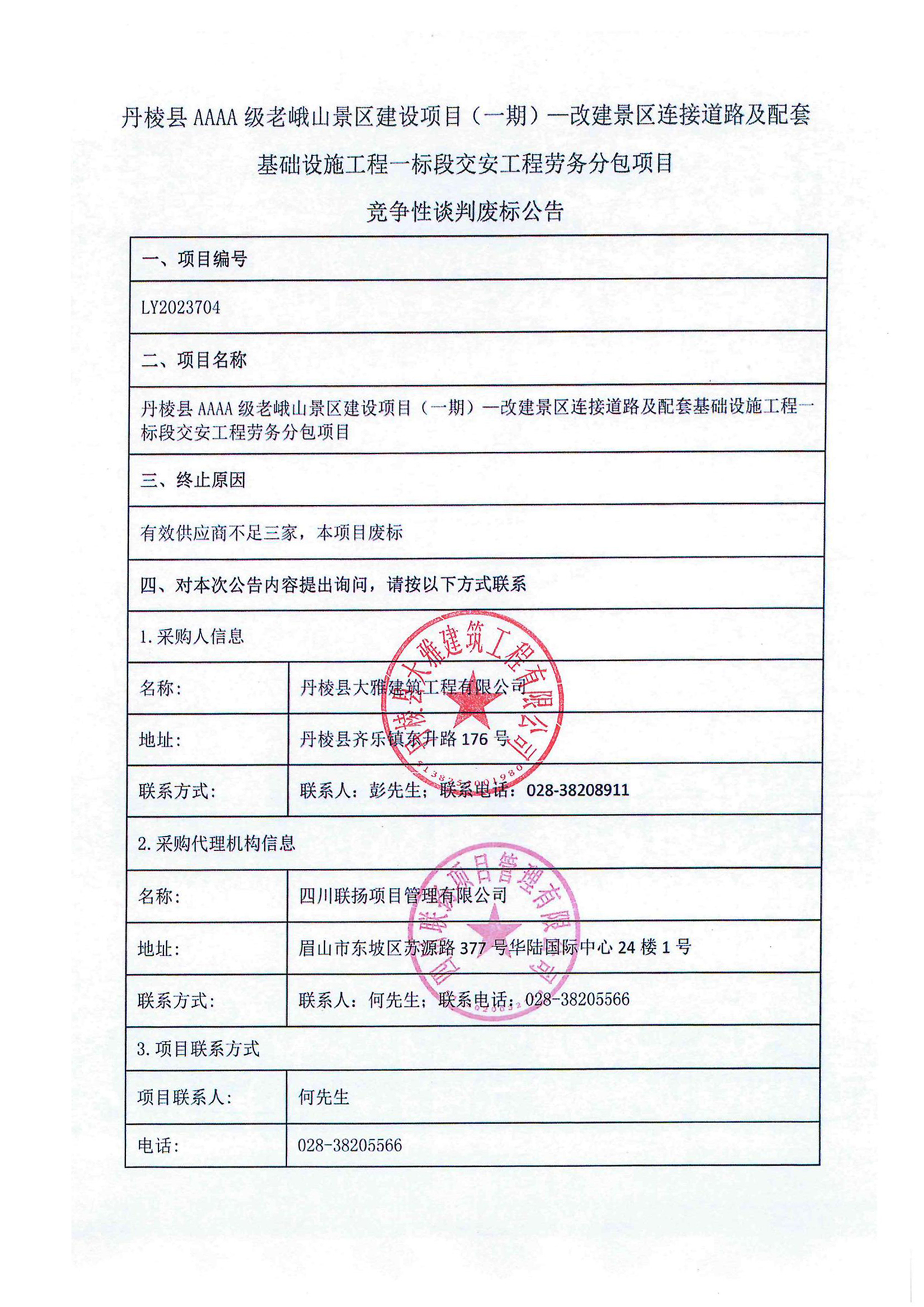 丹棱縣AAAA級老峨山景區建設項目(一期)一改建景區連接道路及配套基礎設施工程一標段交安工程勞務(wù)分包項目競爭性談判廢標公告