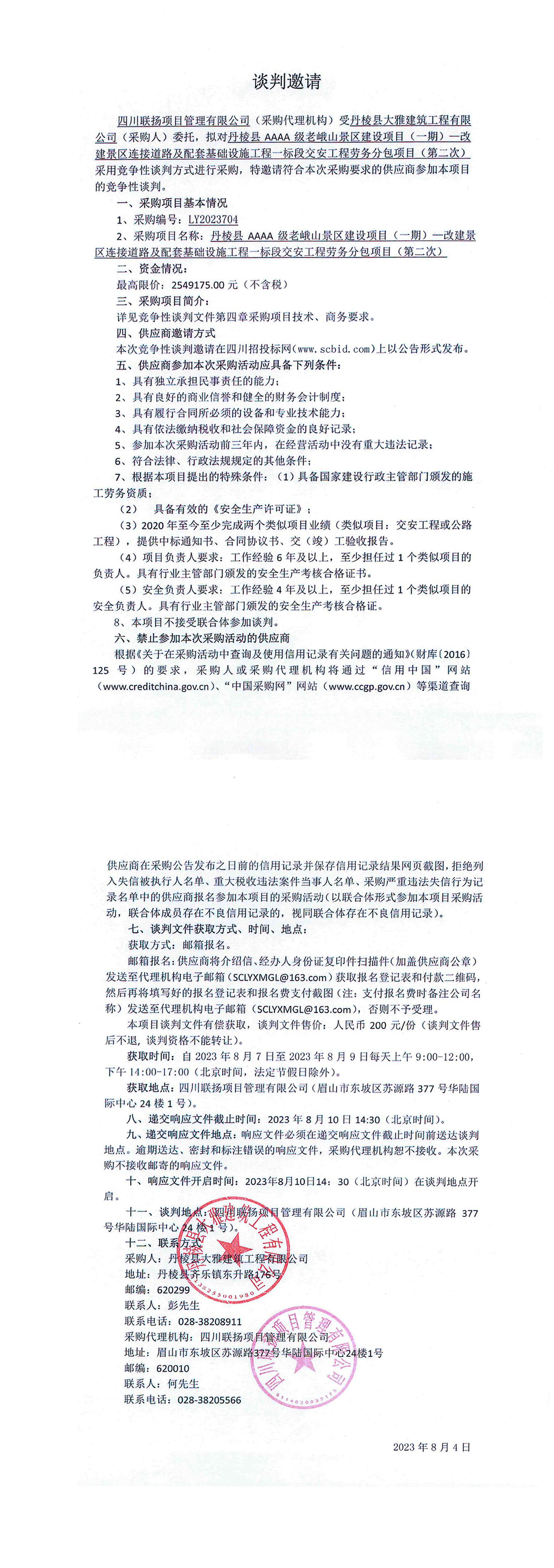 丹棱縣AAAA級老峨山景區建設項目(一期)一改建景區連接道路及配套基礎設施工程一標段交安工程勞務(wù)分包項目(第二次)談判邀請