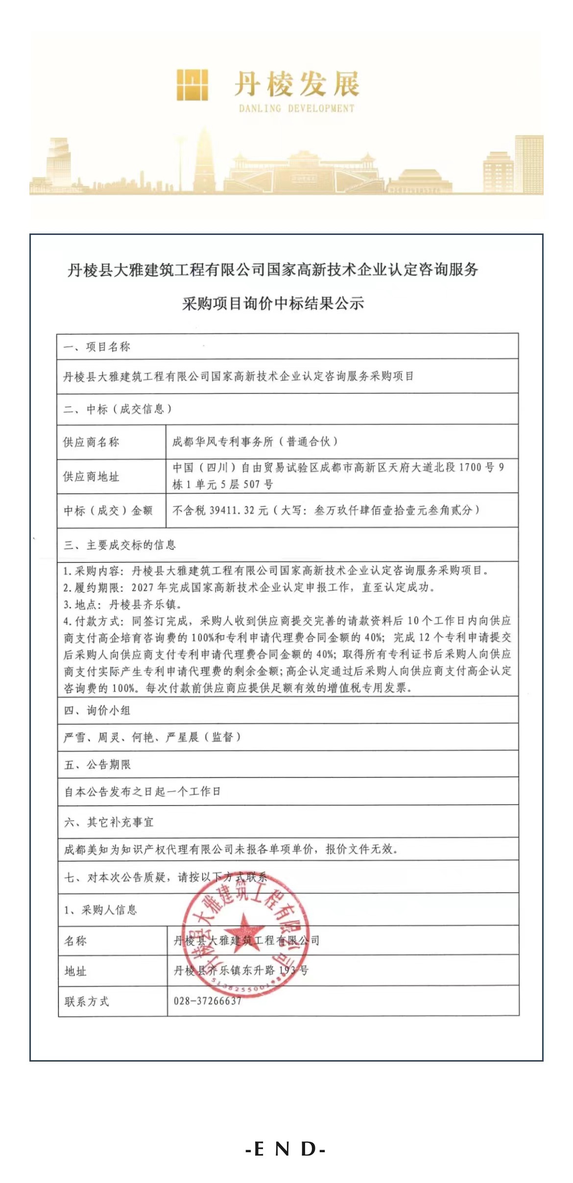 丹棱縣大雅建筑工程有限公司國家高新技術(shù)企業(yè)認定咨詢(xún)服務(wù)采購項目詢(xún)價(jià)中標結果公示