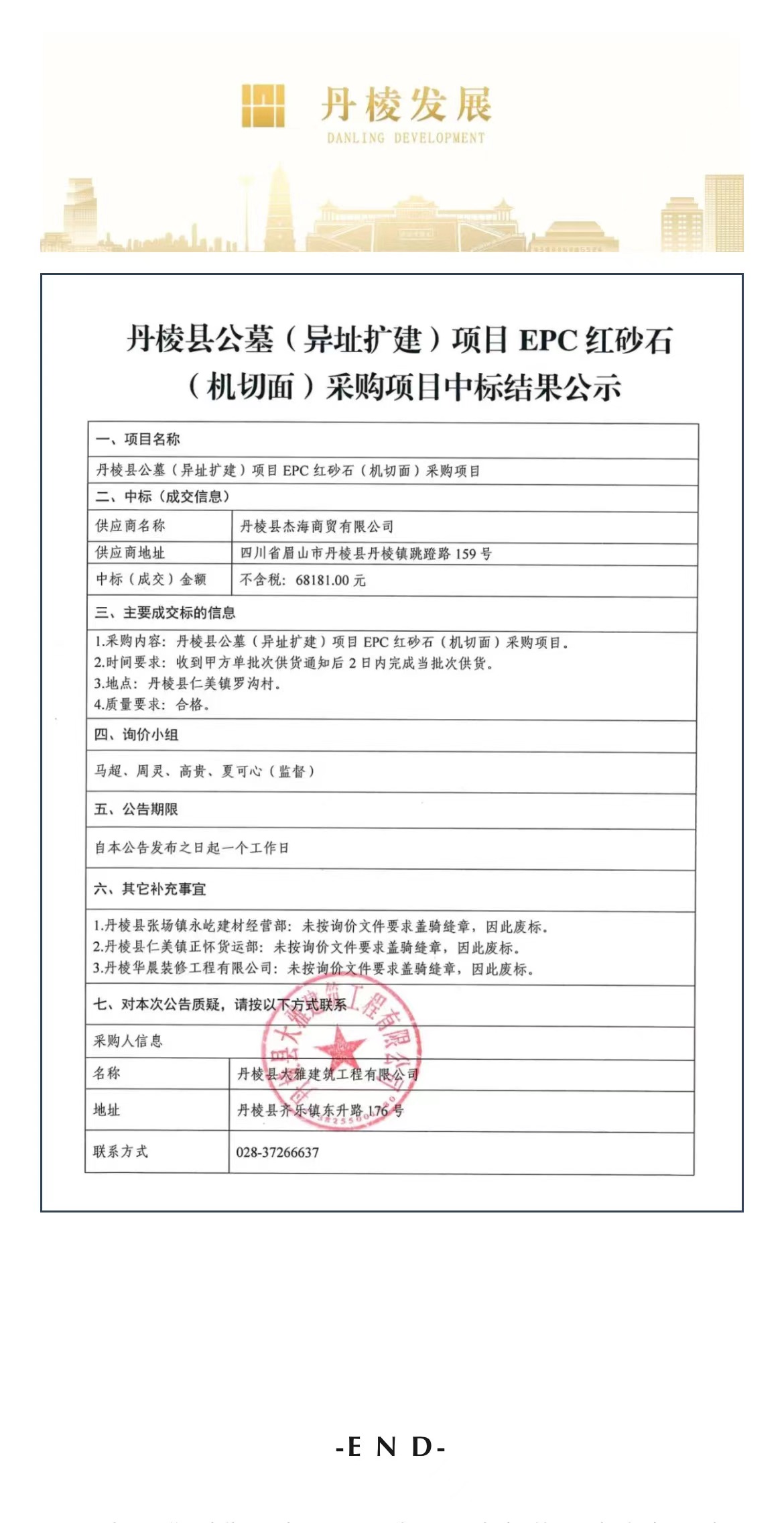 丹棱縣公墓(異址擴建)項目EPC紅砂石(機切面)采購項目中標結果公示