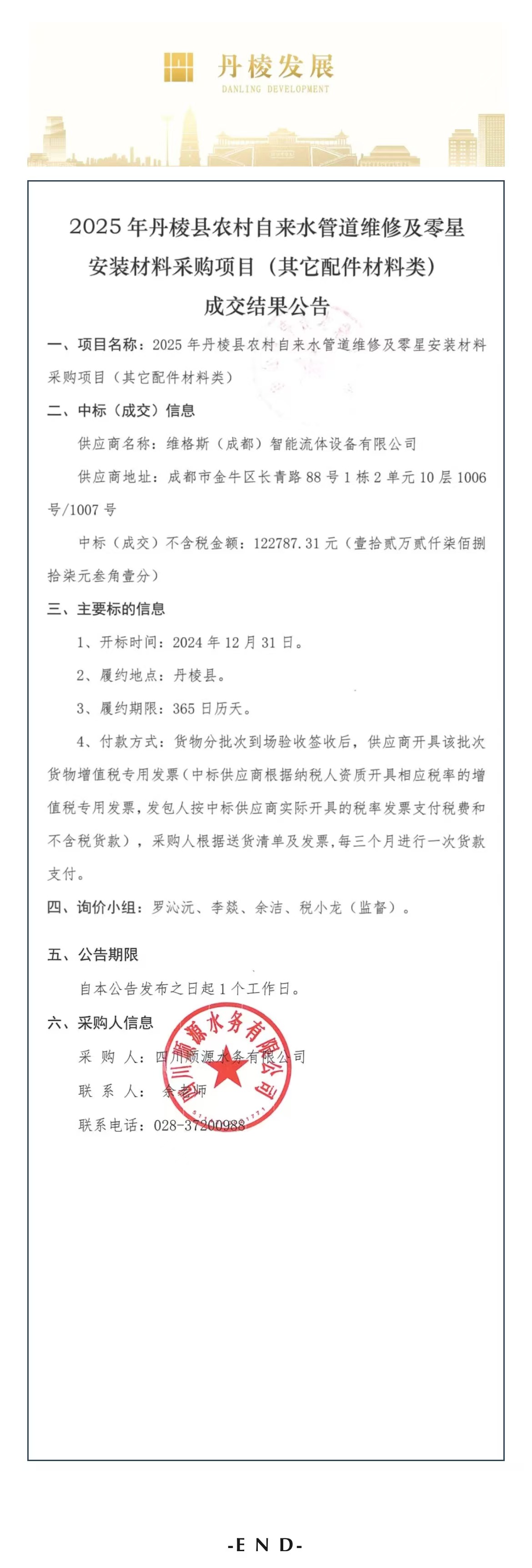 2025年丹棱縣農村自來(lái)水管道維修及零星安裝材料采購項目(其他配件材料類(lèi))成交結果公告