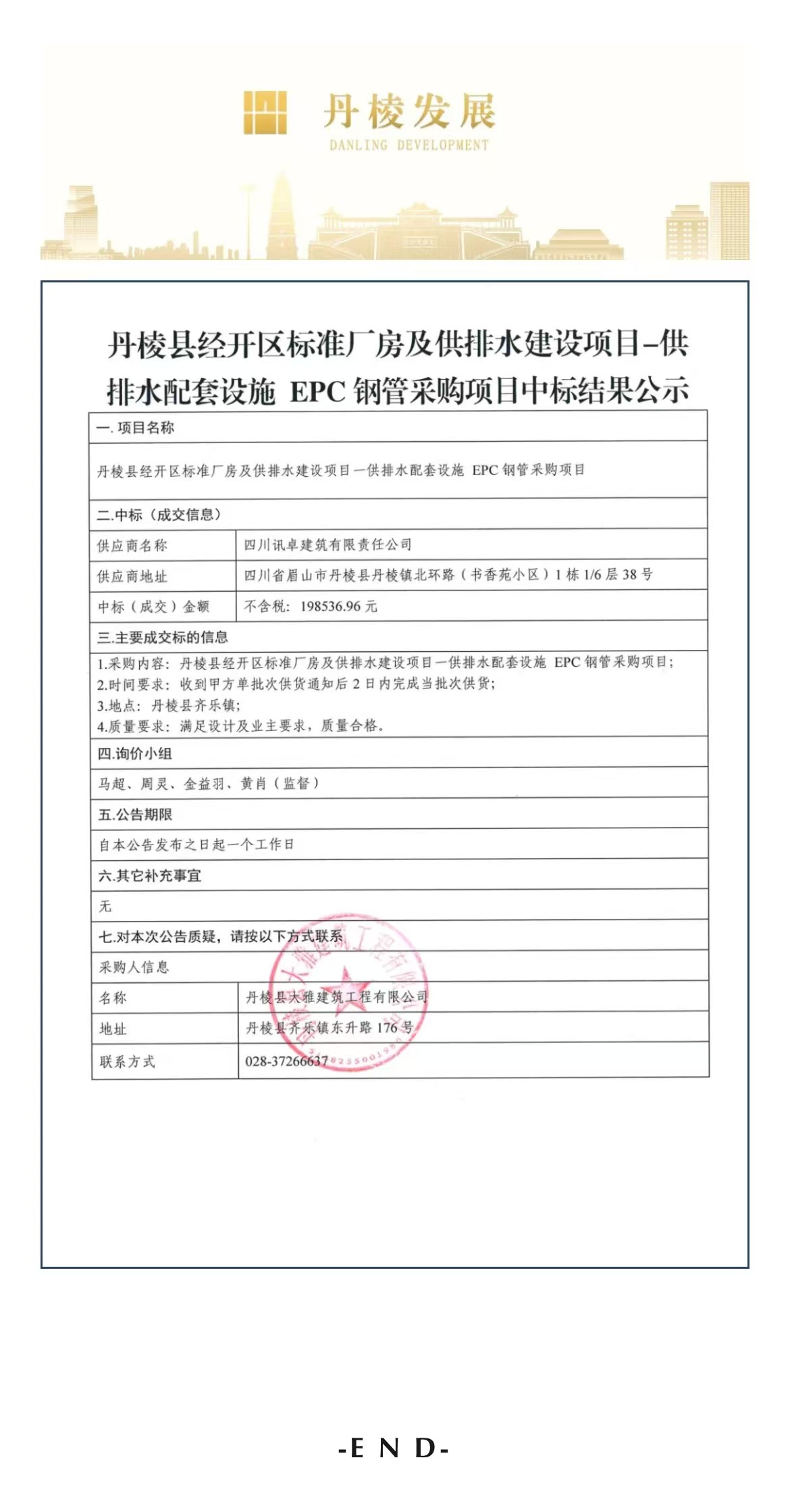 丹棱縣經(jīng)開(kāi)區標準廠(chǎng)房及供排水建設項目——供排水配套設施EPC鋼管采購項目中標結果公示