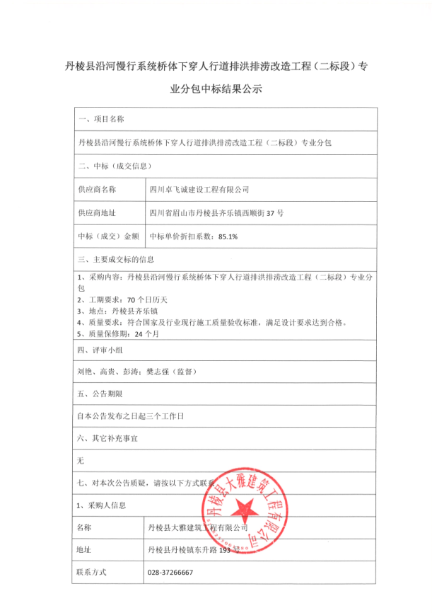【大雅建筑公司】丹棱縣沿河慢行系統橋體下穿人行道排洪排澇改造工程(二標段)專(zhuān)業(yè)分包中標結果公示