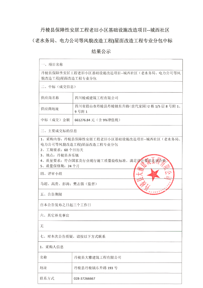 【大雅建筑公司】丹棱縣保障性安居工程老舊小區基礎設施改造項目--城西社區(老水務(wù)局、電力公司等風(fēng)貌改造工程)屋面改造工程專(zhuān)業(yè)分包中標結果公示