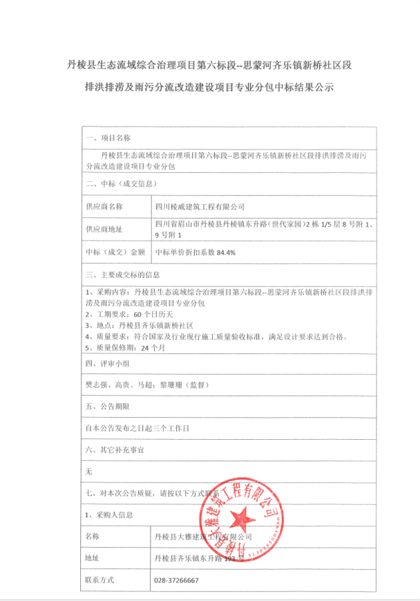 【大雅建筑公司】丹棱縣生態(tài)流域綜合治理項目第六標段—思蒙河齊樂(lè )鎮新橋社區段排洪排澇及雨污分流改造建設項目專(zhuān)業(yè)分包中標結果公示