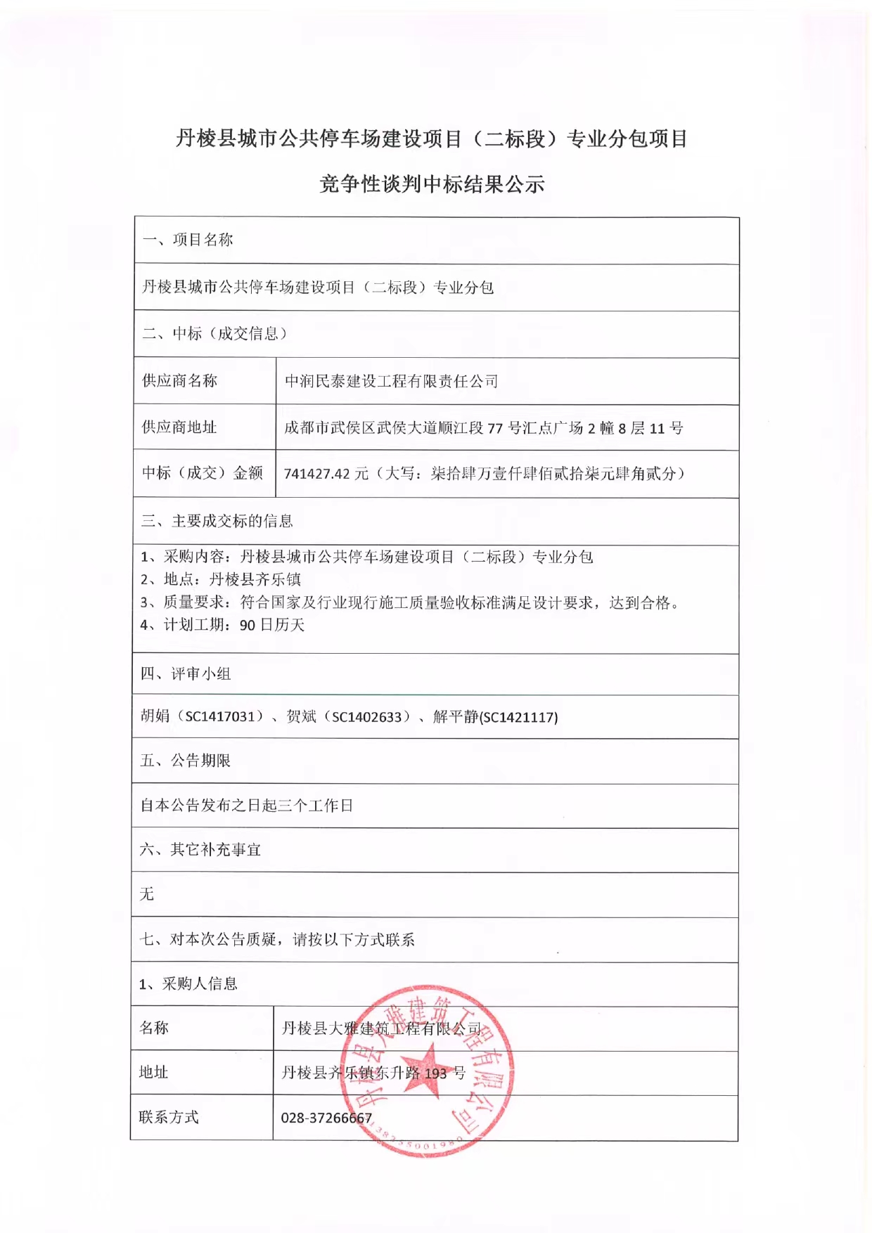 丹棱縣城市公共停車(chē)場(chǎng)建設項目(二標段)專(zhuān)業(yè)分包項目競爭性談判中標結果公示