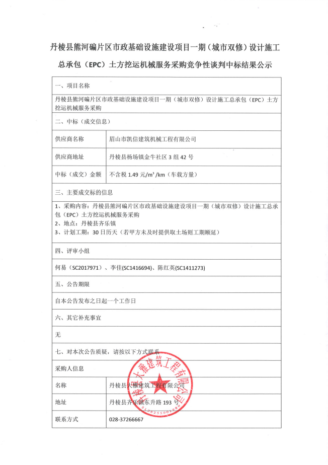 丹棱縣熊河碥片區市政基礎設施建設項目一期(城市雙修)設計施工 總承包(EPC)土方挖運機械服務(wù)采購競爭性談判中標結果公示
