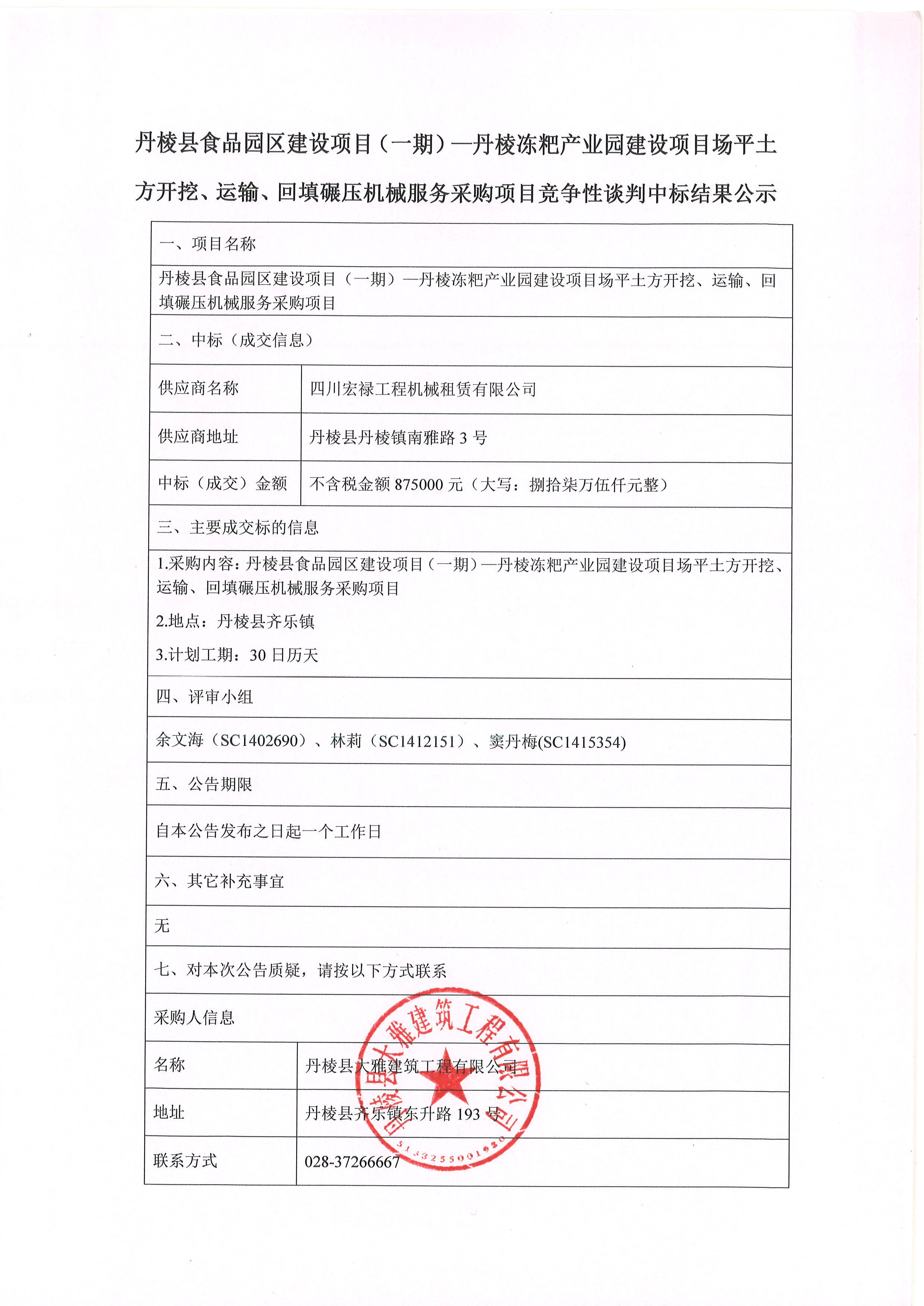 丹棱縣食品園區建設項目(一期)-丹棱凍粑產(chǎn)業(yè)園建設項目場(chǎng)平土 方開(kāi)挖、運輸、回填碾壓機械服務(wù)采購項目競爭性談判中標結果公示