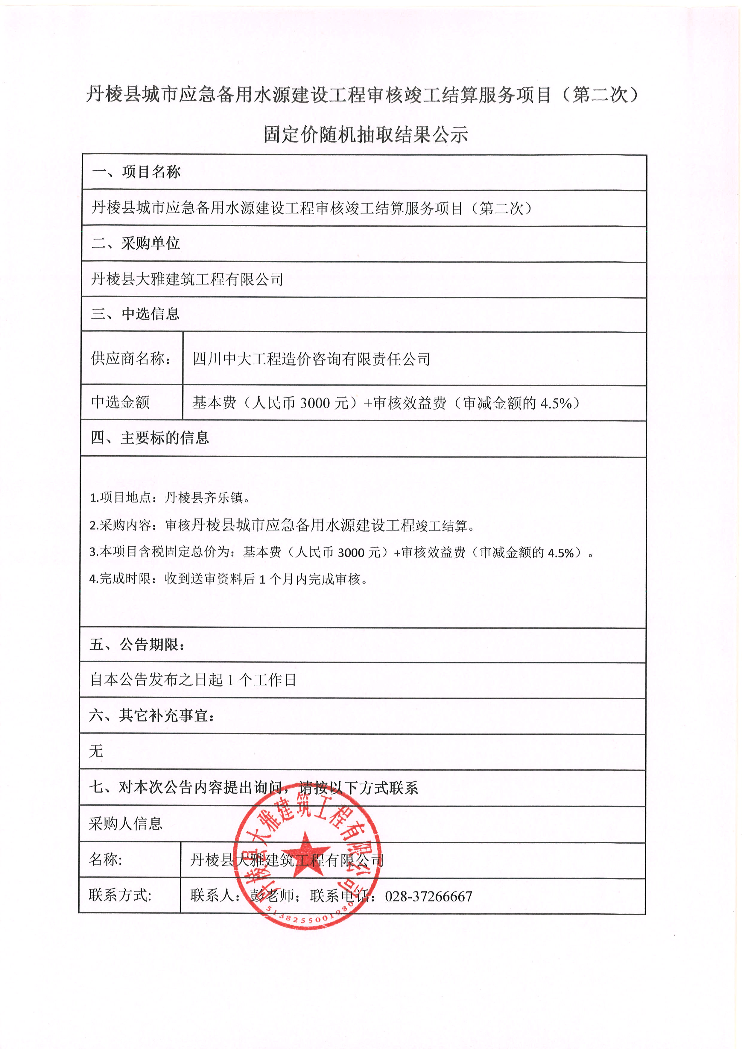 丹棱縣城市應急備用水源建設工程審核竣工結算服務(wù)項目(第二次) 固定價(jià)隨機抽取結果公示