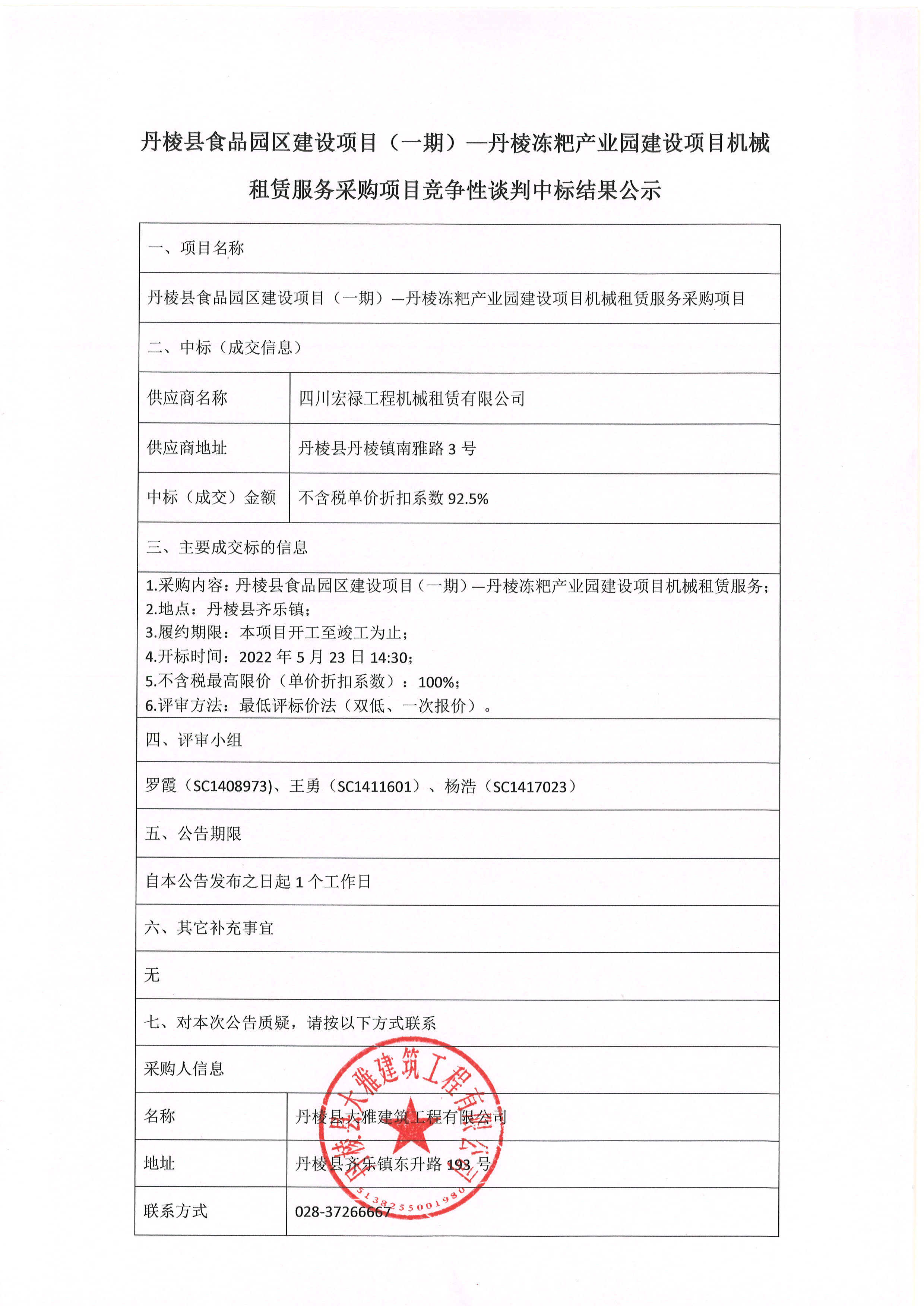 丹棱縣食品園區建設項目(一期)-丹棱凍粑產(chǎn)業(yè)園建設項目機械 租賃服務(wù)采購項目競爭性談判中標結果公示