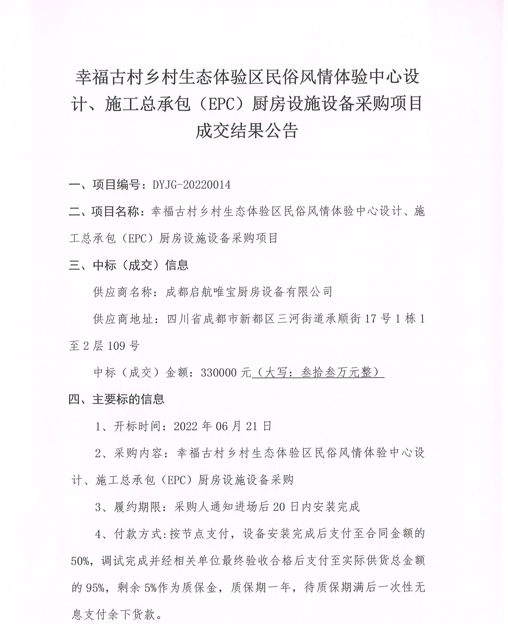 幸福古村鄉村生態(tài)體驗區民俗風(fēng)情體驗中心設計、施工總承包(EPC)廚房設施設備采購項目成交結果公告