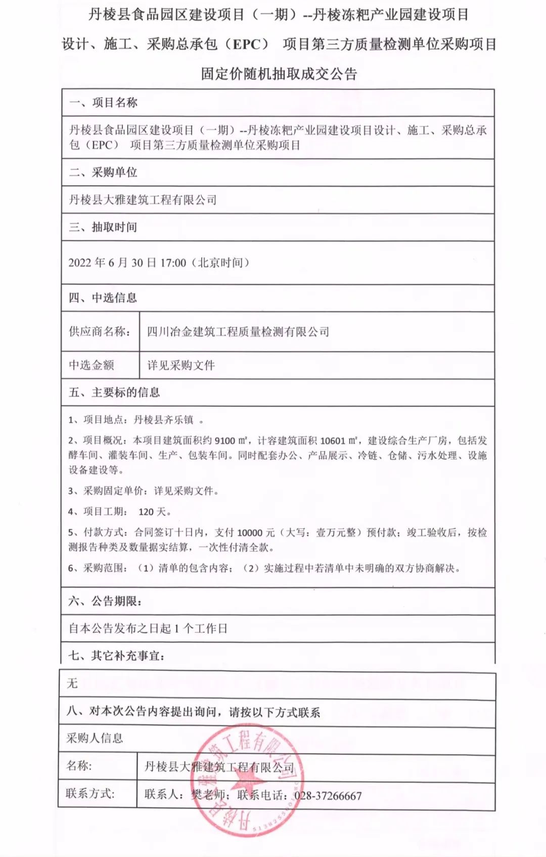 丹棱凍粑產(chǎn)業(yè)園建設項目設計、施工、采購總承包(EPC)項目第三方質(zhì)量檢測單位采購項目固定價(jià)隨機抽取成交公告
