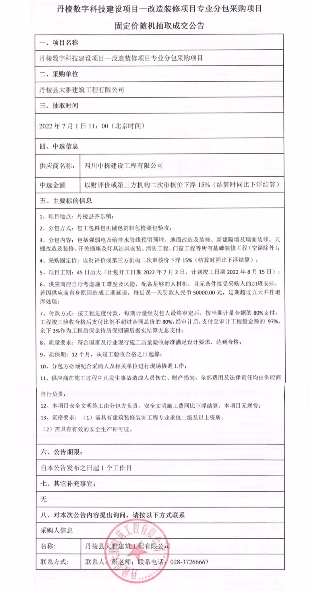丹棱數字科技建設項目--改造裝修項目專(zhuān)業(yè)分包采購項目固定價(jià)隨機抽取成交公告
