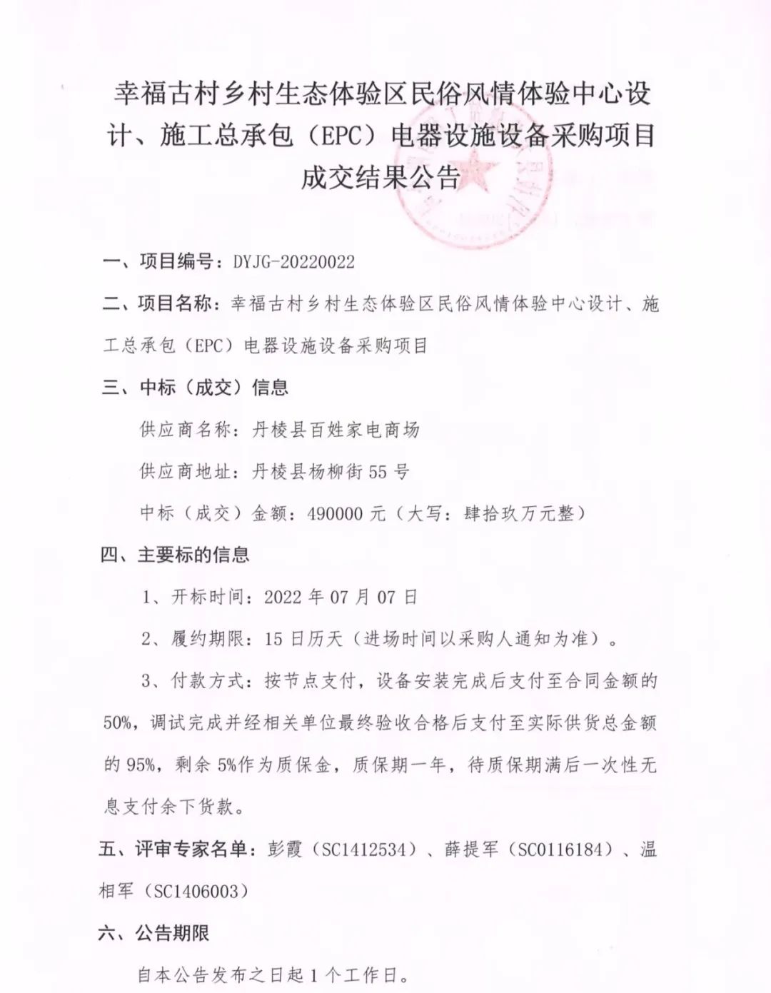 幸福古村鄉村生態(tài)體驗區民俗風(fēng)情體驗中心設計、施工總承包(EPC)電器設施設備采購項目成交結果公告