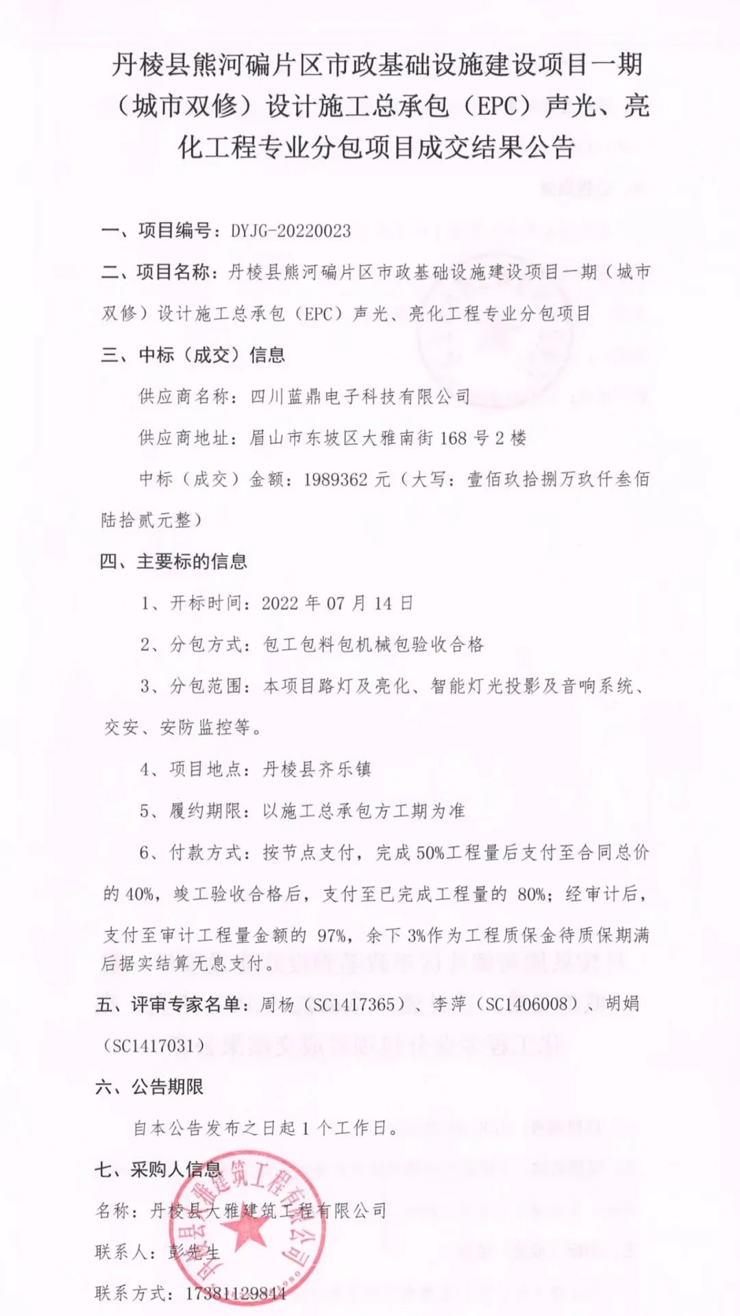 丹棱縣熊河碥片區市政基礎設施建設項目一期(城市雙修)設計施工總承包(EPC)聲光、亮化工程專(zhuān)業(yè)分包項目成交結果公告