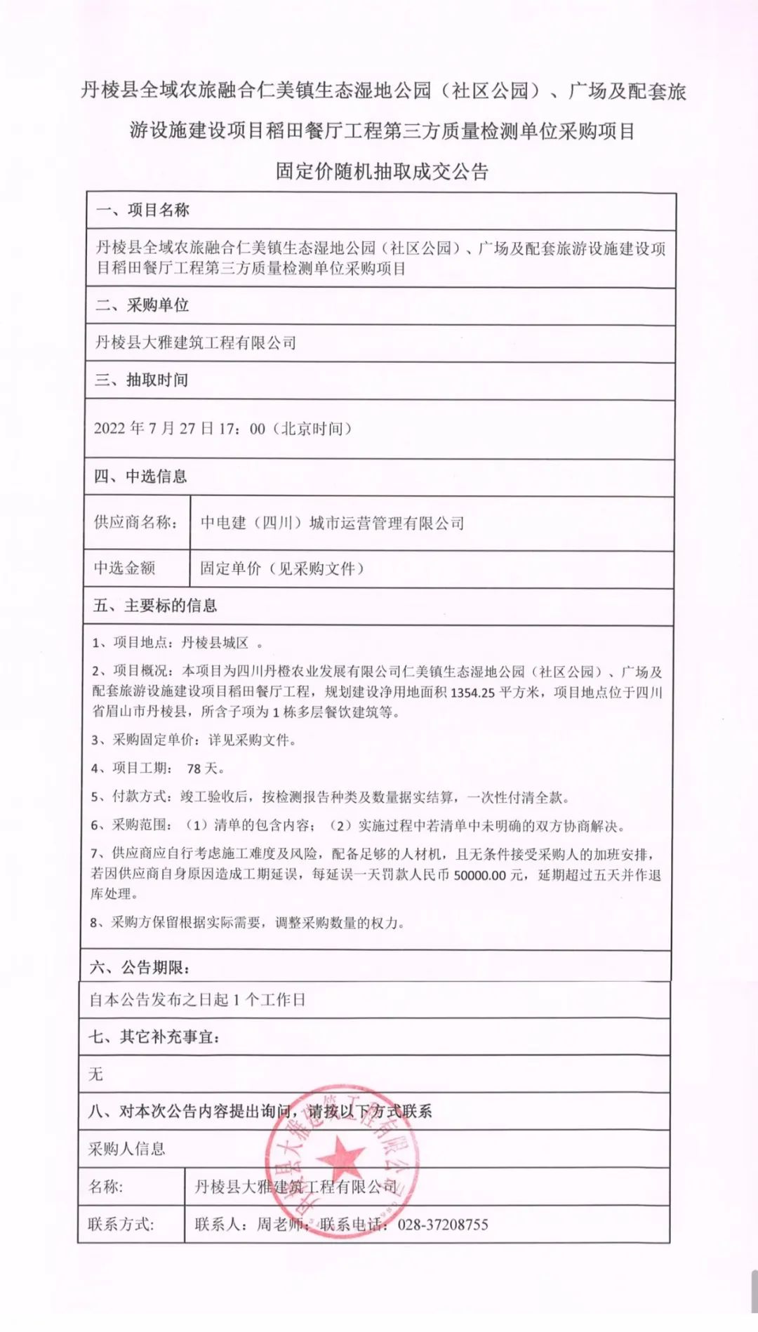 仁美鎮生態(tài)濕地公園(社區公園)、廣場(chǎng)及配套旅游設施建設項目稻田餐廳工程第三方質(zhì)量檢測單位采購項目固定價(jià)隨機抽取成交公告