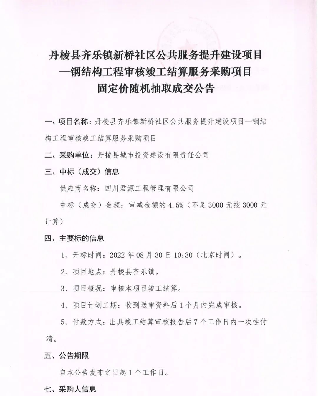 丹棱縣齊樂(lè )鎮新橋社區公共服務(wù)提升建設項目--鋼結構工程審核竣工結算服務(wù)采購項目固定價(jià)隨機抽取成交公告