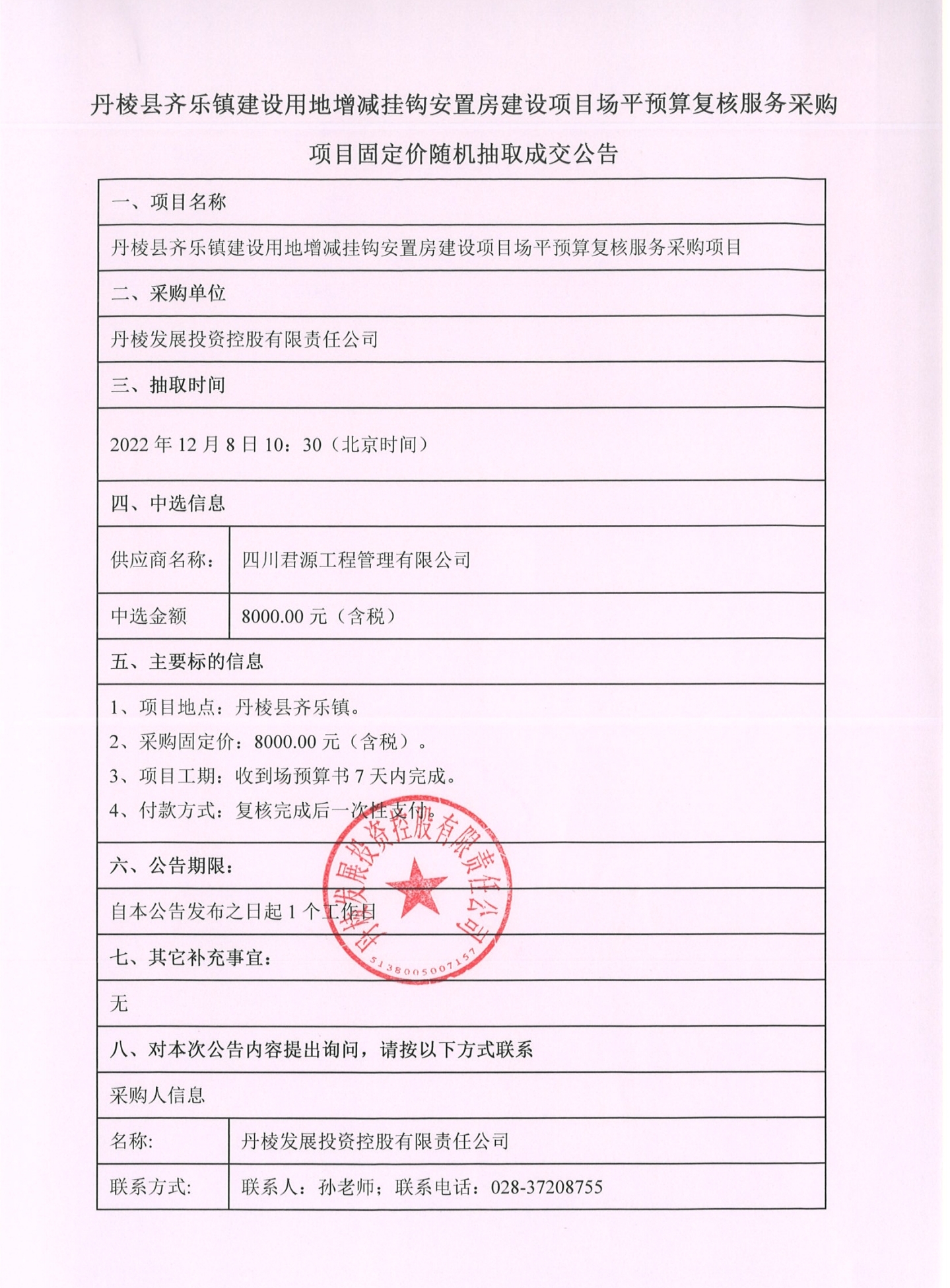 丹棱縣齊樂(lè )鎮建設用地增減掛鉤安置房建設項目場(chǎng)平預算復核服務(wù)采購項目固定價(jià)隨機抽取成交公告
