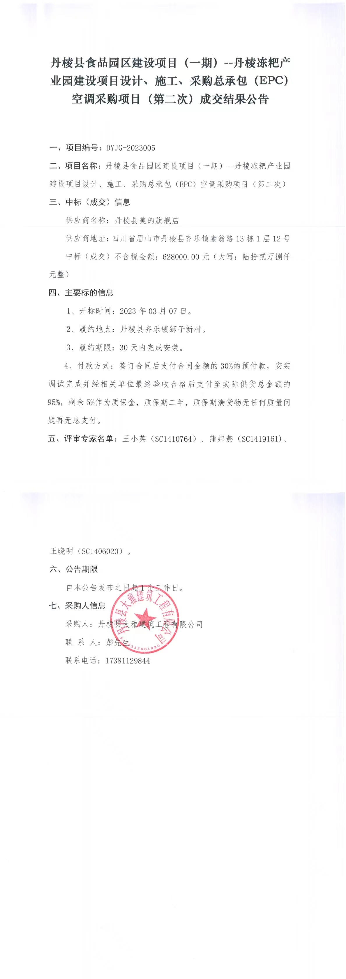 丹棱縣食品園區建設項目(一期)--丹棱凍粑產(chǎn)業(yè)園建設項目設計、施工、采購總承包(EPC)空調采購項目(第二次)成交結果公告
