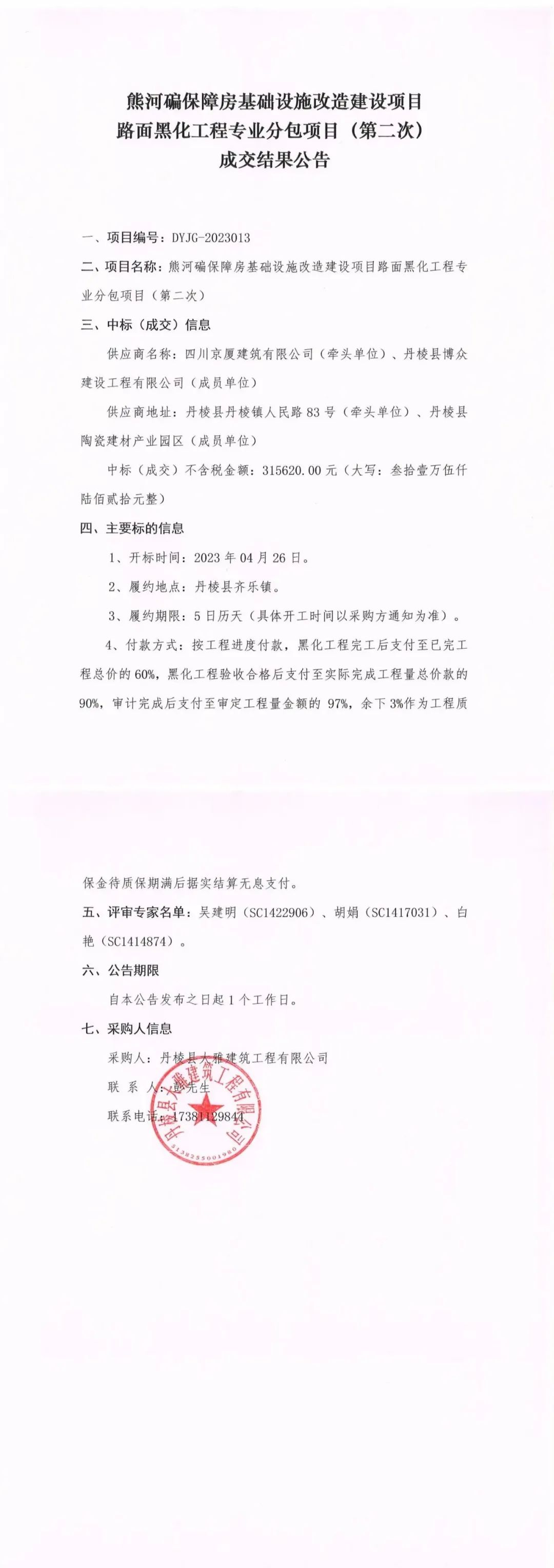 熊河碥保障房基礎設施改造建設項目路面黑化工程專(zhuān)業(yè)分包項目 (第二次)成交結果公告