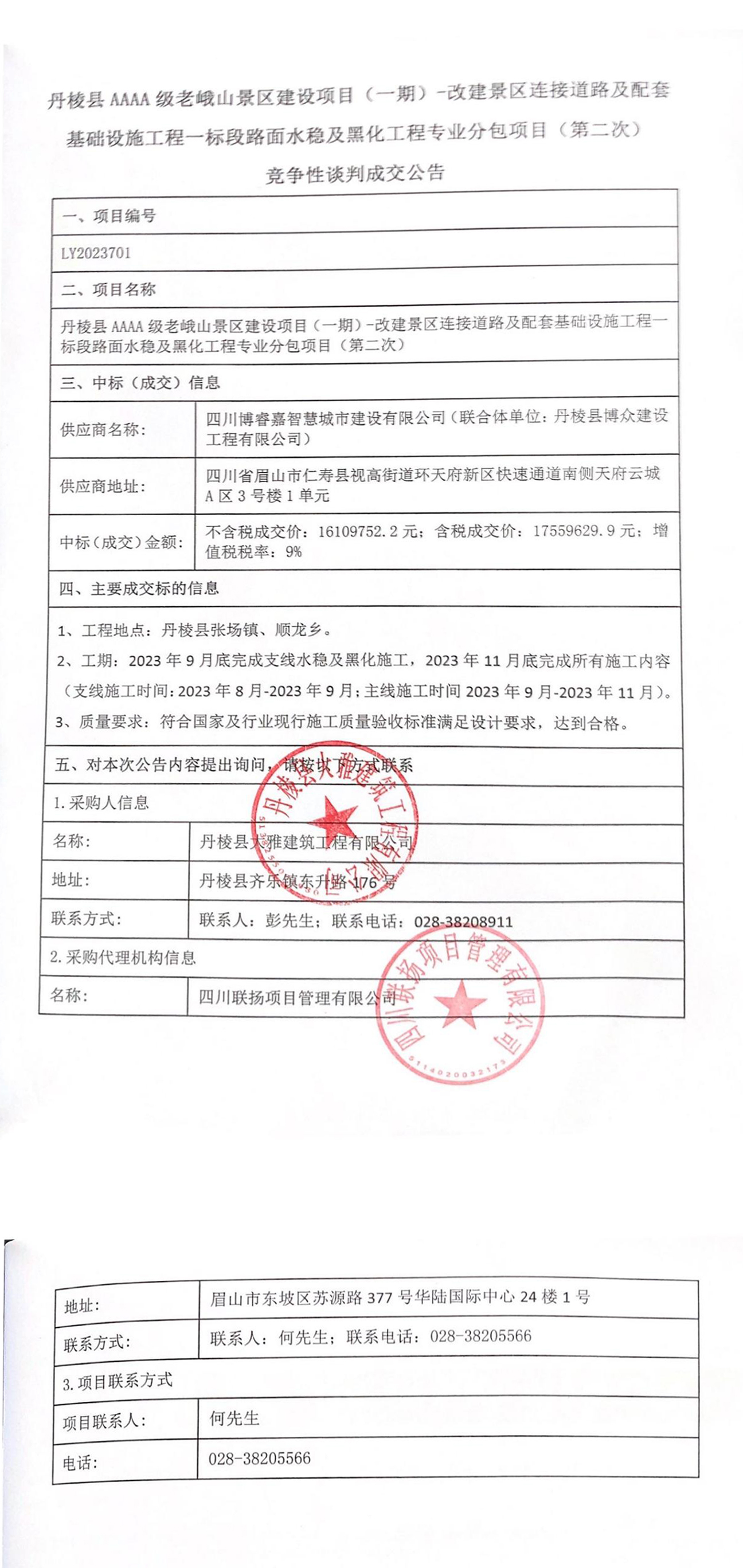 丹棱縣AAAA級老峨山景區建設項目(一期)—改建景區連接道路及配套基礎設施工程一標段路面水穩及黑化工程專(zhuān)業(yè)分包項目成交公告