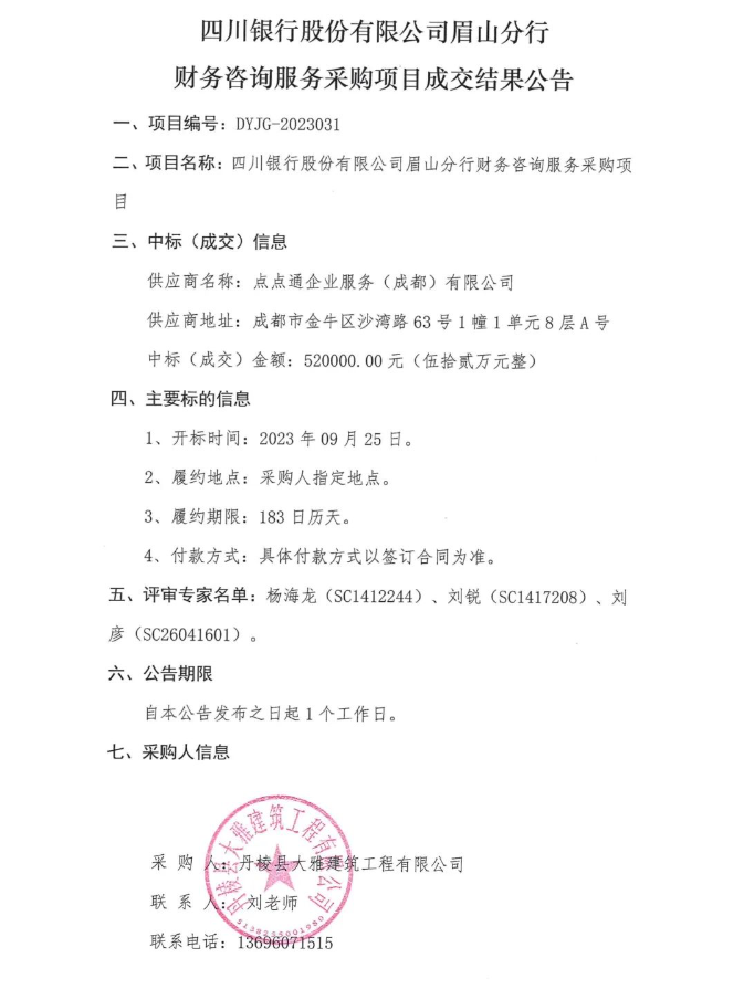 四川銀行股份有限公司眉山分行財務(wù)咨詢(xún)服務(wù)采購項目成交結果公告