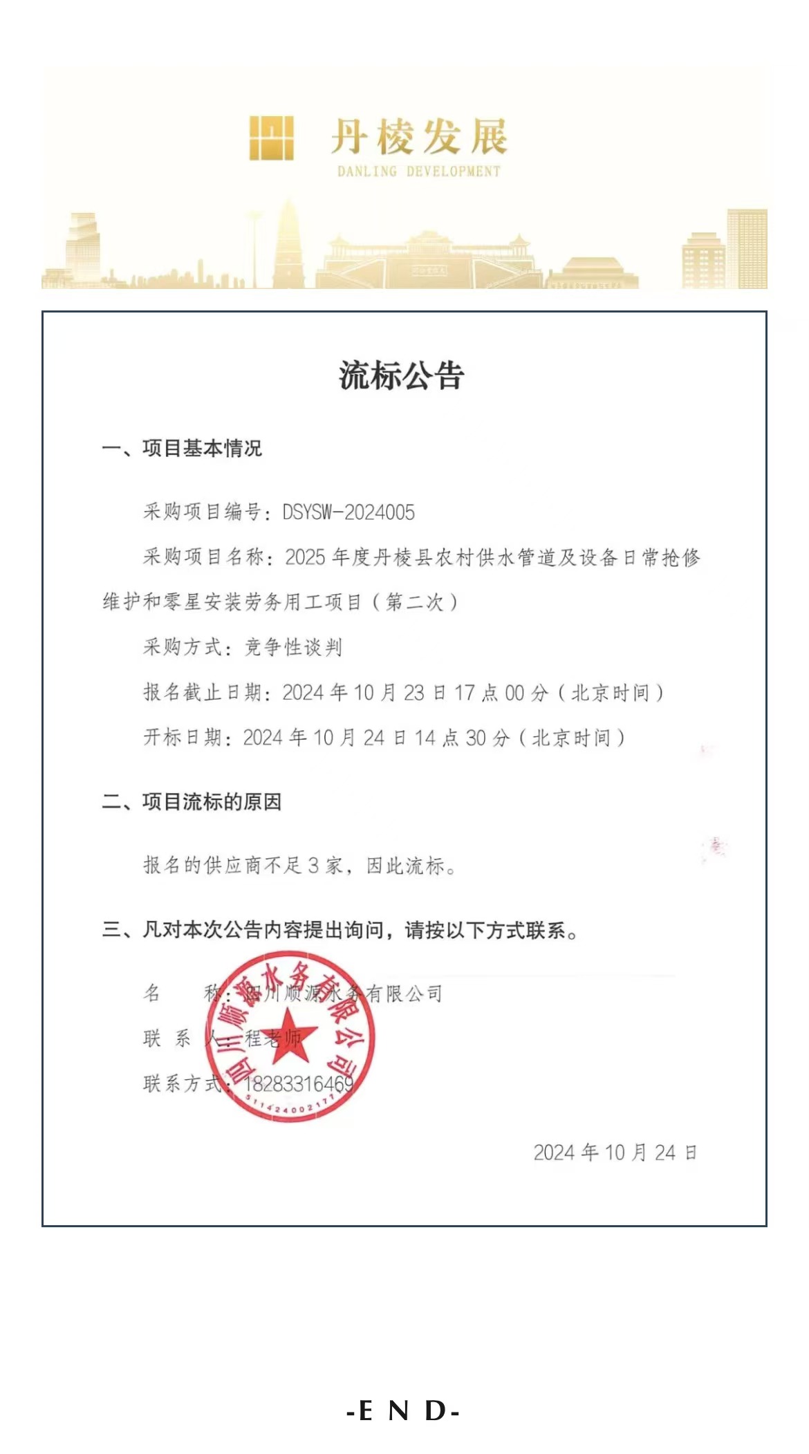 2025年度丹棱縣農村供水管道及設備日常搶修維護和零星安裝勞務(wù)用工項目(第二次)流標公告