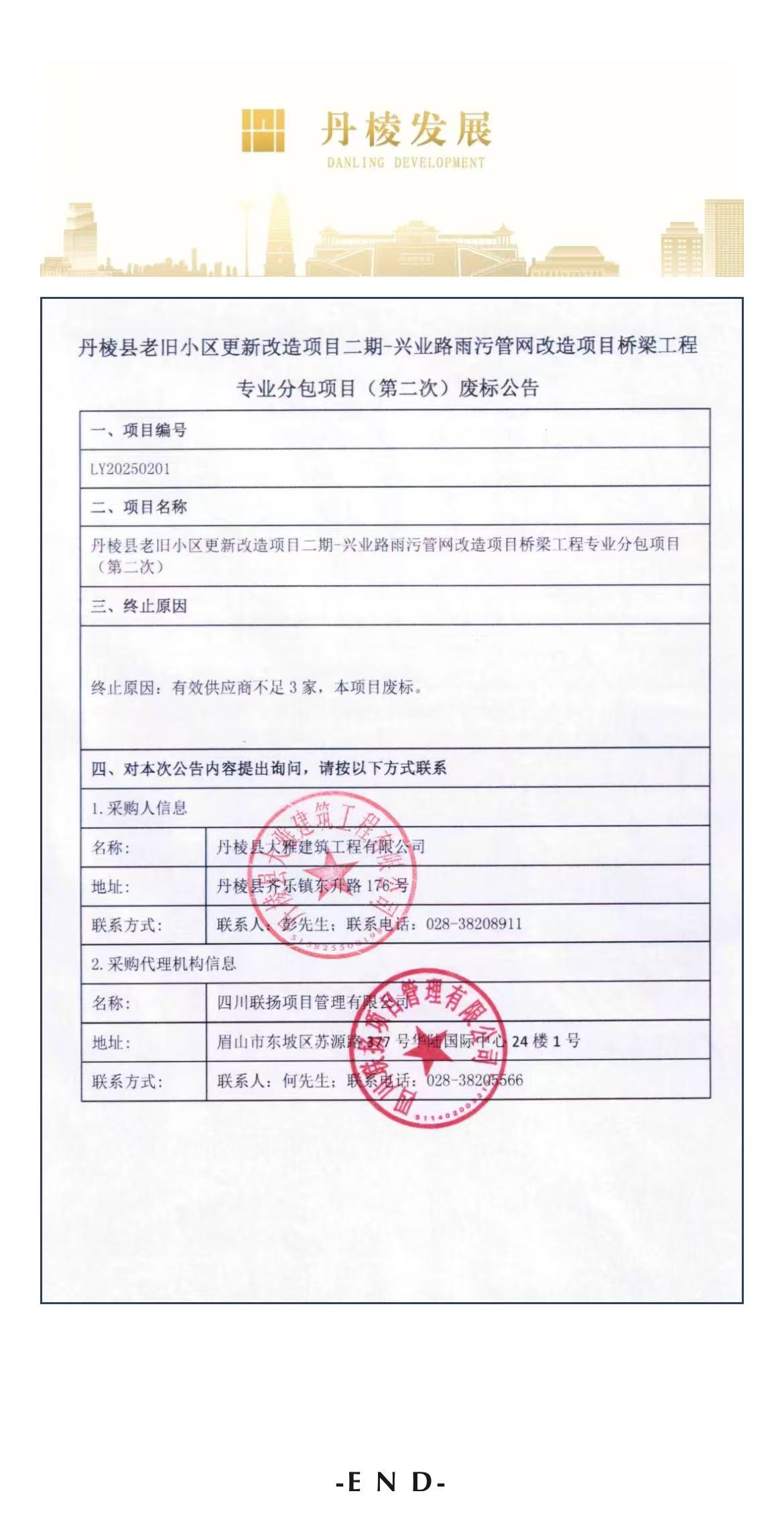 丹棱縣老舊小區更新改造項目二期-興業(yè)路雨污管網(wǎng)改造項目橋梁工程專(zhuān)業(yè)分包項目(第二次)廢標公告
