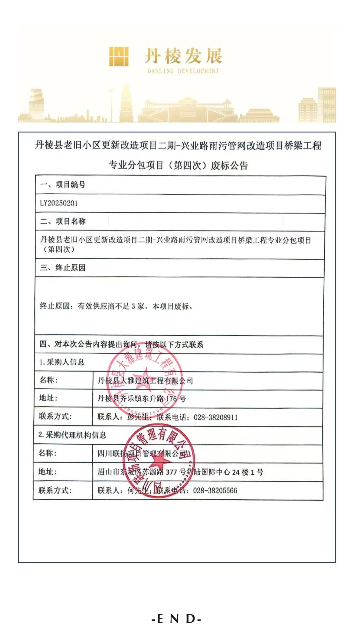 丹棱縣老舊小區更新改造項目二期-興業(yè)路雨污管網(wǎng)改造項目橋梁工程專(zhuān)業(yè)分包項目(第四次)廢標公告